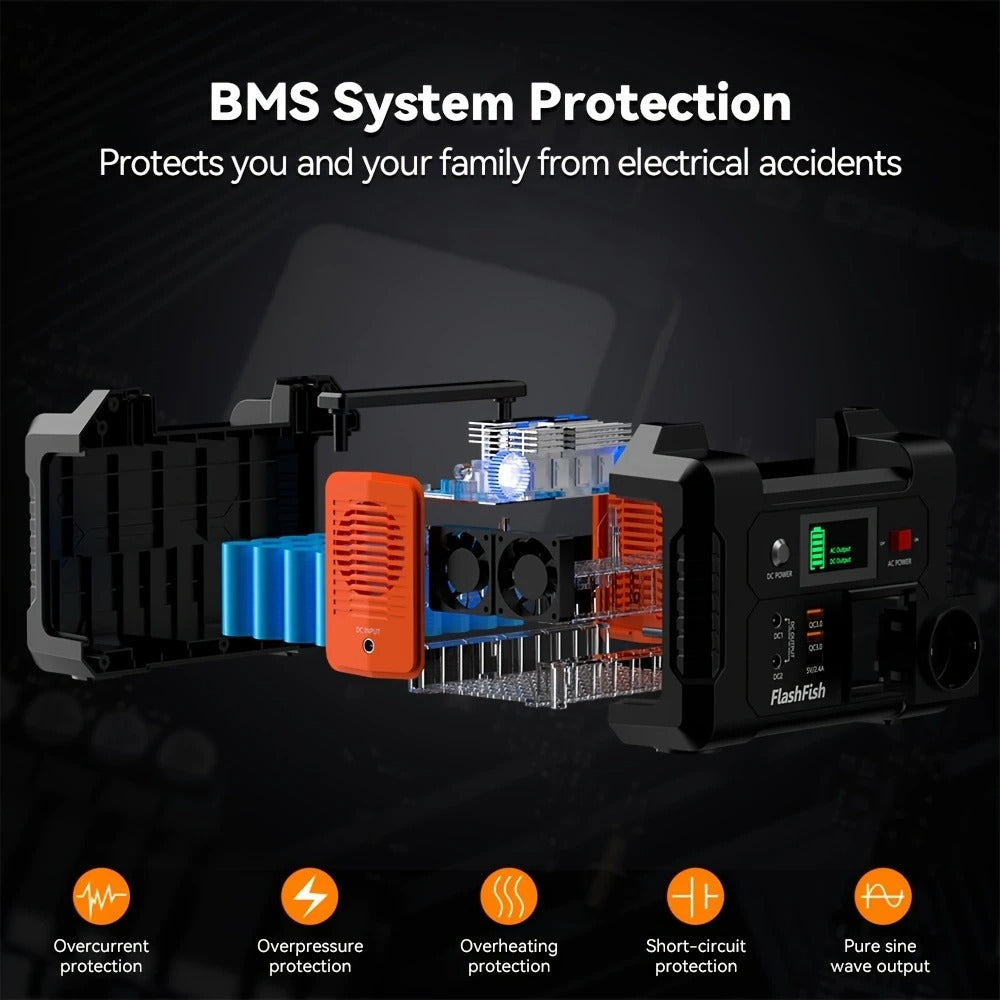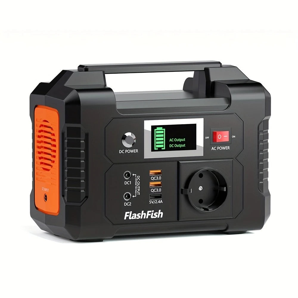 Flashfish E200 – tai kompaktiška ir galinga nešiojama energijos stotelė su 151 Wh (40800 mAh) talpos ličio jonų baterija ir 200 W galios gryno sinuso bangos AC išėjimu. Ši stotelė leidžia vienu metu įkrauti iki 7 įrenginių: ji turi AC, DC, USB ir automobilinį išėjimą, o įmontuoti du QC3.0 greito įkrovimo USB lizdai padeda greitai papildyti telefonų, planšečių ar kitų prietaisų energiją. Dėl mažo dydžio, tik 1,85 kg svorio ir patogios rankenos, E200 idealiai tinka kelionėms, stovyklavimui, darbui lauke ar avariniam elektros tiekimui. Įkraunama per saulės panelę (15–24 V), sieninį arba automobilinį lizdą, ši energijos stotelė yra patikimas sprendimas buityje ir gamtoje. Išmanioji BMS sistema užtikrina apsaugą nuo perkrovimo, perkaitimo, trumpojo jungimo ir kitų rizikų. Integruotas LCD ekranas leidžia aiškiai matyti baterijos lygį ir veikimo režimą bet kokiomis sąlygomis.