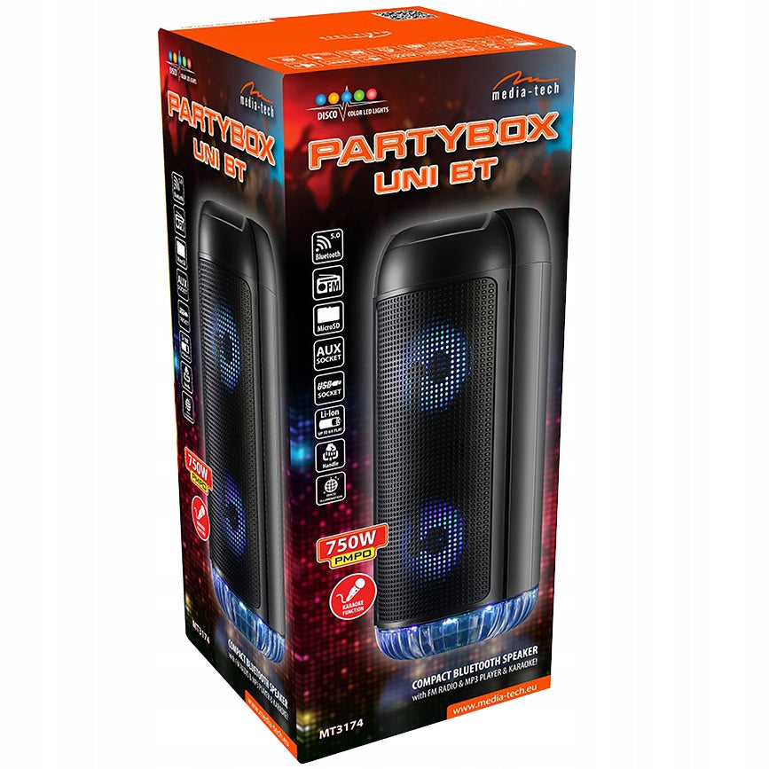 Partybox UNI BT pasižymi išskirtine garso kokybe, kurią užtikrina du 4 colių garsiakalbiai, kartu generuojantys 30W RMS (750W PMPO) galią. Tai reiškia sodrius žemuosius dažnius ir aiškius aukštuosius tonus, leidžiančius mėgautis muzika visu garsu. Belaidė „Bluetooth 5.0“ technologija leidžia lengvai ir stabiliai transliuoti muziką iš jūsų išmaniojo telefono, planšetinio kompiuterio ar kito suderinamo įrenginio. Tačiau galimybės nesibaigia – integruoti lizdai muzikai leisti iš „micro SD“ kortelių ir USB laikmenų (pvz., „pendrive“) praplečia jūsų muzikinį pasaulį. Papildomas 3,5 mm AUX įėjimas suteikia galimybę prijungti beveik bet kokį garso šaltinį, didinant sistemos universalumą.