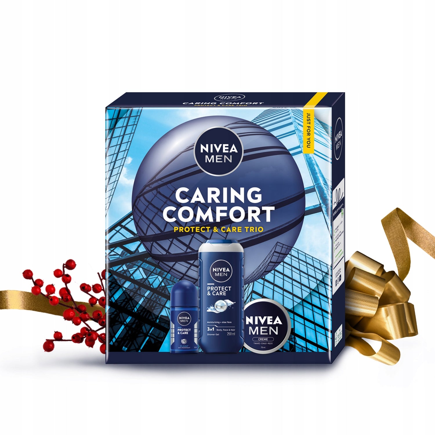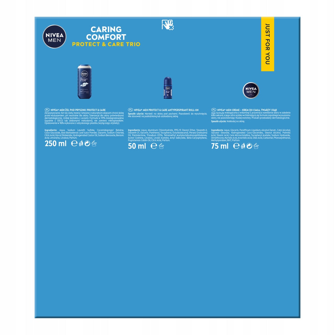Švenčių metas – puiki proga parodyti, kad jums rūpi ne tik jis, bet ir jo oda. Ieškodami išskirtinės dovanos, rinkitės NIVEA MEN CARING COMFORT rinkinį, kurio produktai ne tik intensyviai drėkins, bet ir saugos odą nuo išsausėjimo. Kiekvienas rinkinio komponentas sukurtas taip, kad užtikrintų maksimalų komfortą ir efektyvumą, paliekant odą švelnią ir atgaivintą. Tai ideali dovana vyrui, vertinančiam kokybę ir apgalvotą priežiūrą. Šis rinkinys – tai ne tik priemonės, bet ir visapusiška odos apsauga bei puoselėjimas kasdien.