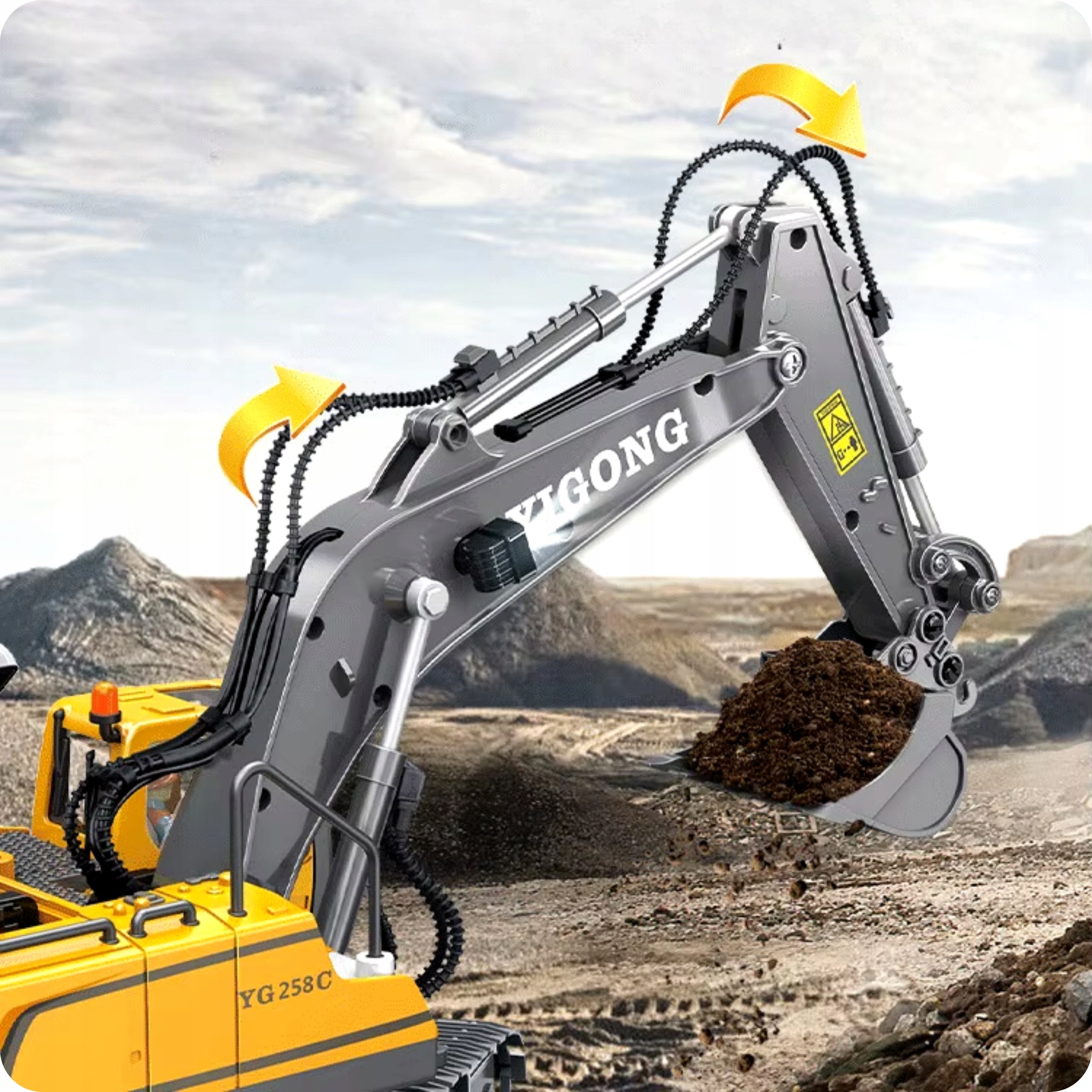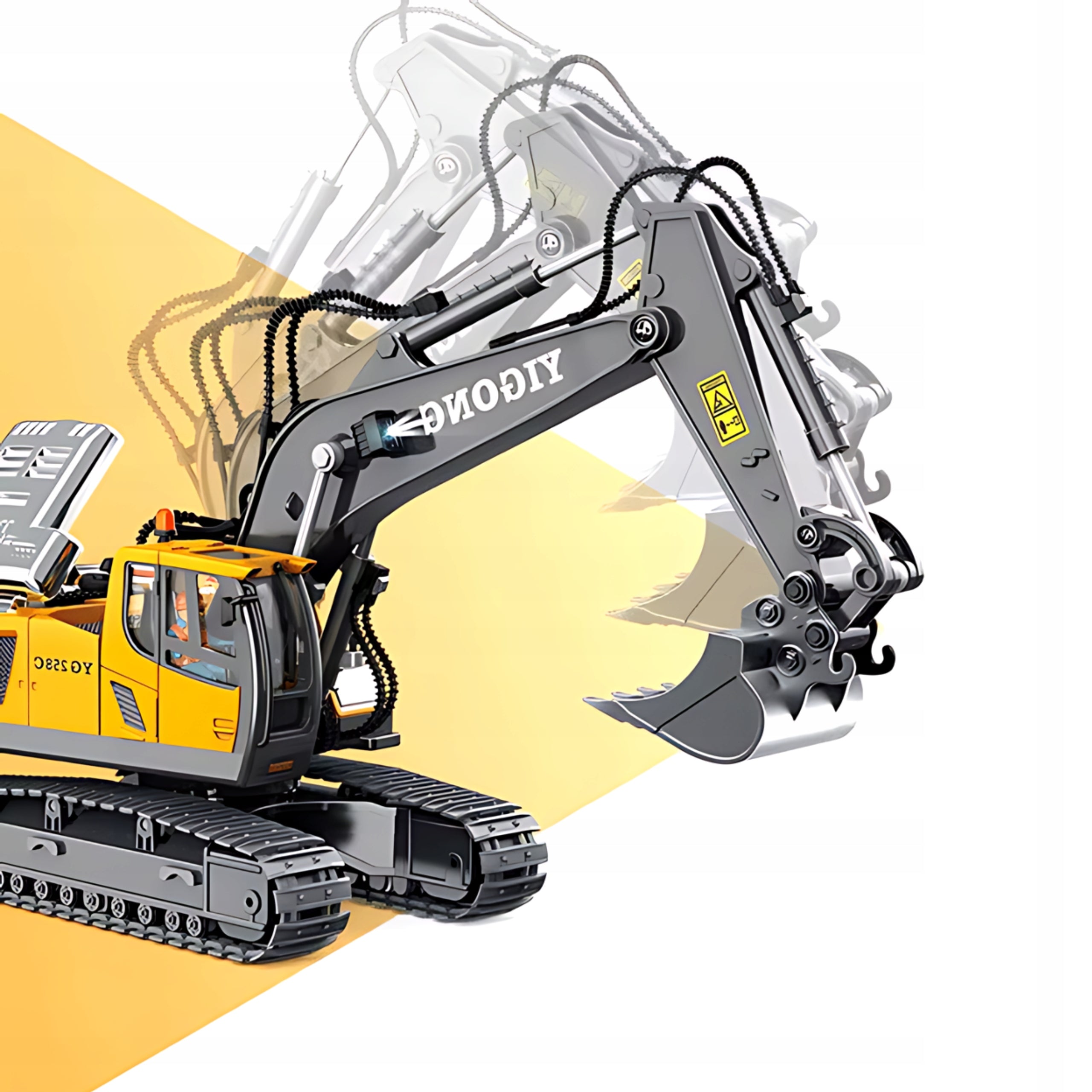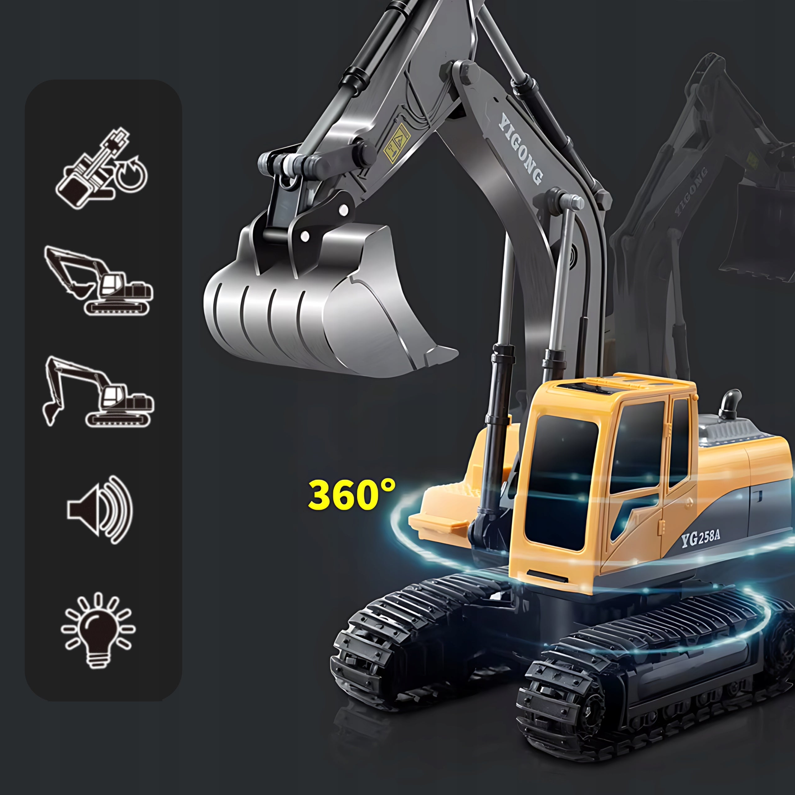 Ši koparka ne tik atrodo realistiškai, bet ir veikia kaip tikra statybinė mašina. Vaikas galės valdyti jos judesius, imituoti kasimo ir krovimo darbus. Pilnas valdymo komplektas su 11 kanalų leidžia atlikti įvairius manevrus: važiavimą pirmyn/atgal, posūkius į kairę ir dešinę, strėlės kėlimą/leidimą, kabinos sukimą. Specialūs mygtukai leidžia įjungti šviesos ir garso efektus, o demonstracijos režimas leidžia koparkai pačiai parodyti savo galimybes, suteikdamas papildomo džiaugsmo ir mokant apie technikos veikimą.