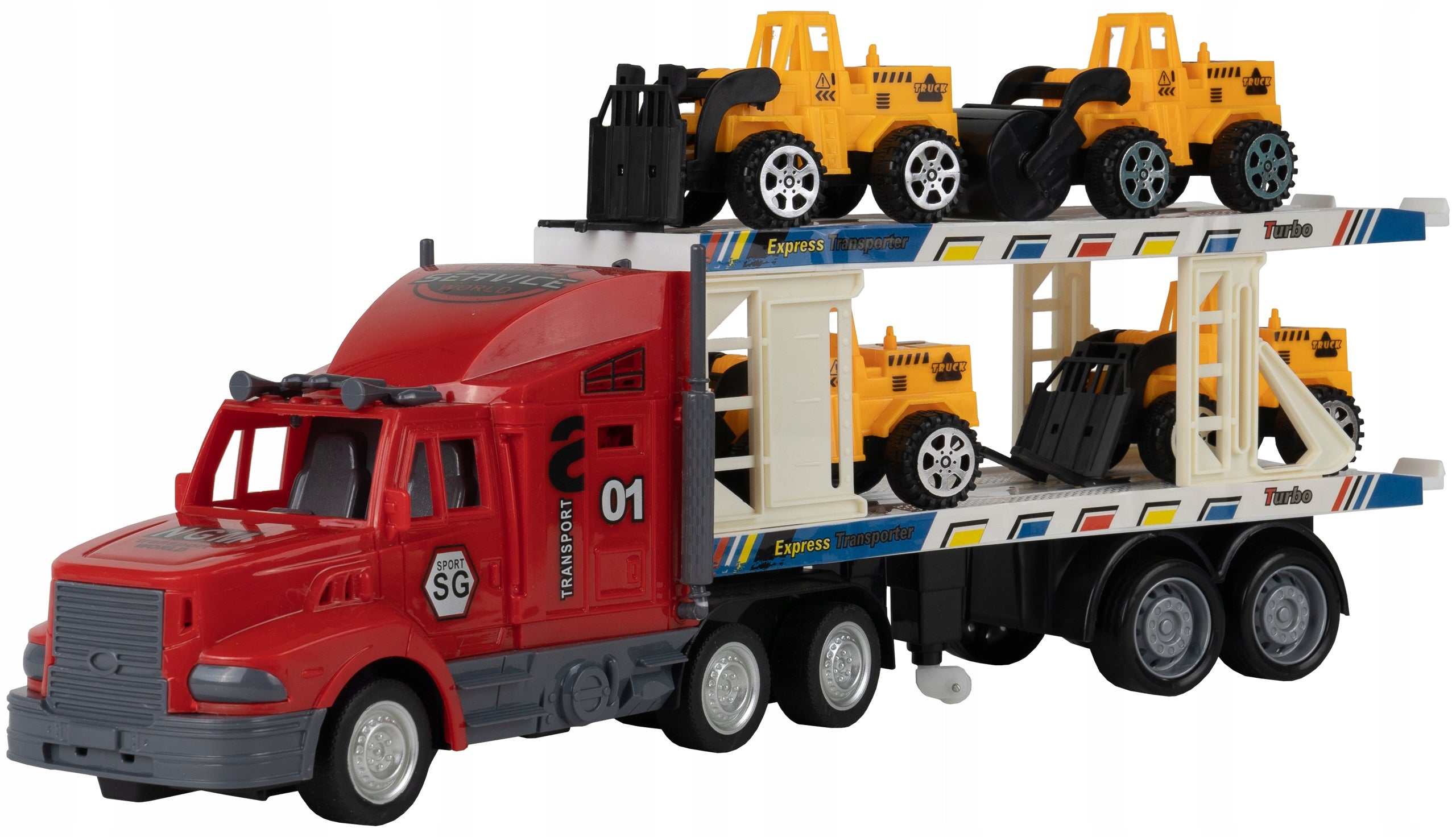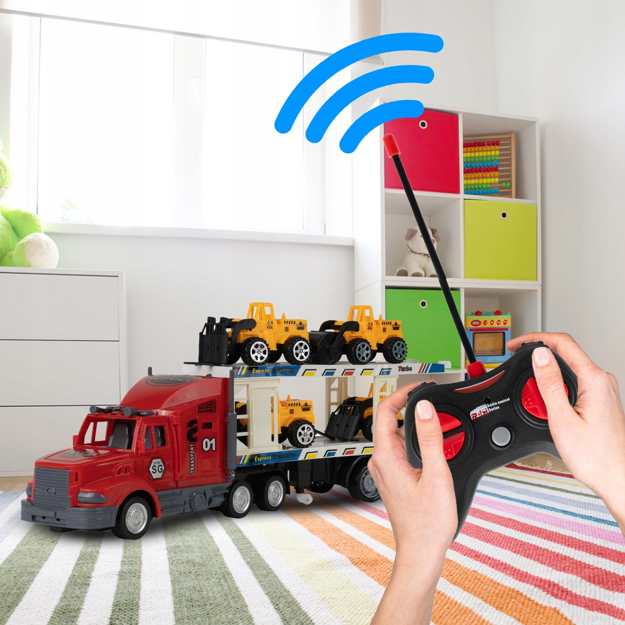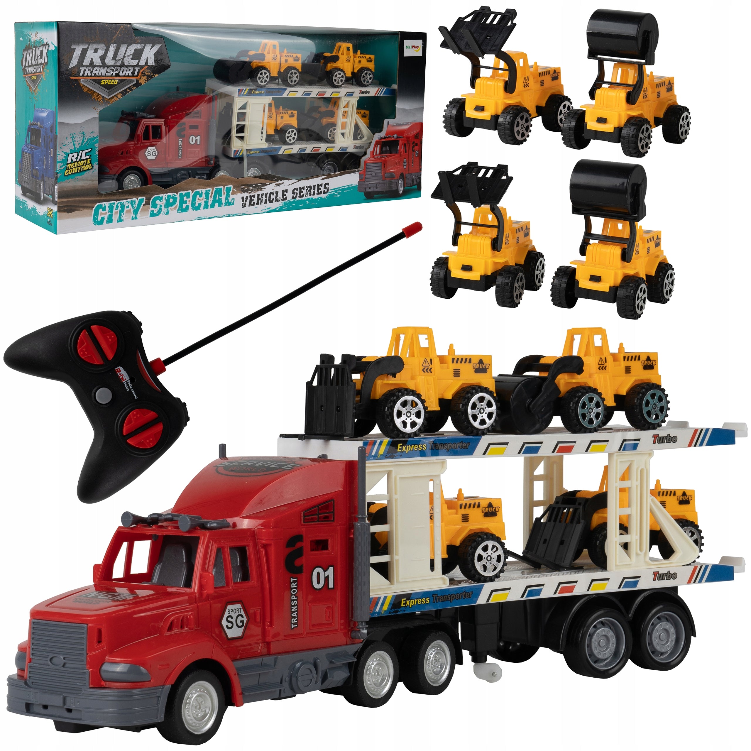 Nuotoliniu būdu valdomas žaislinis vilkikas su priekaba ir statybos transporto priemonėmis