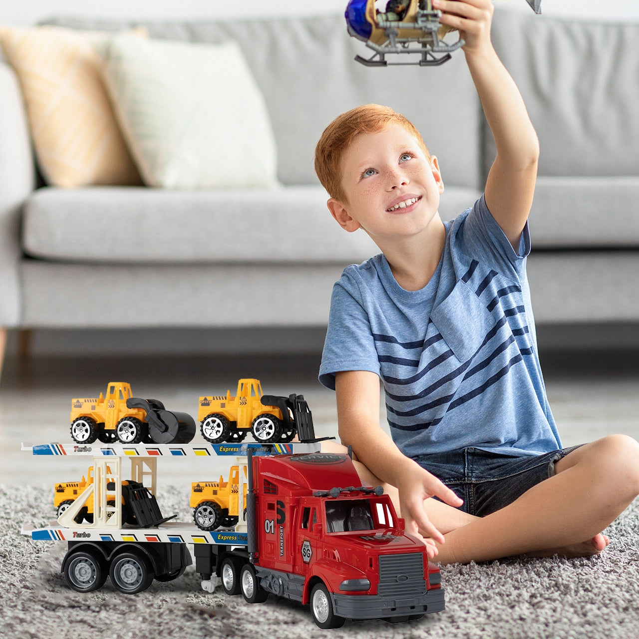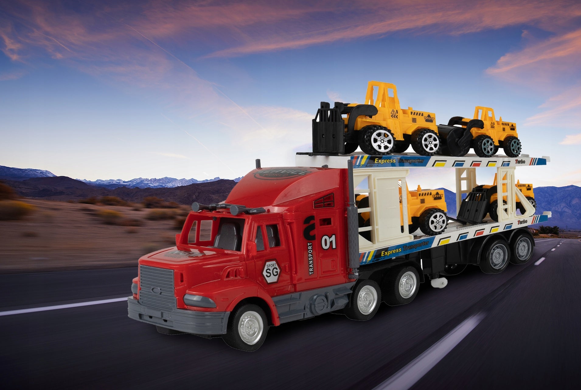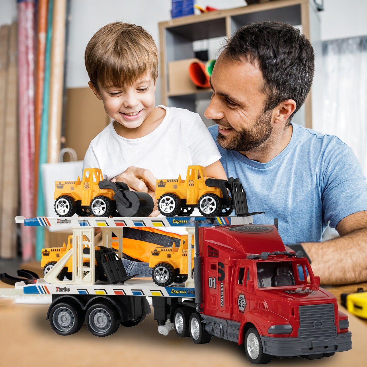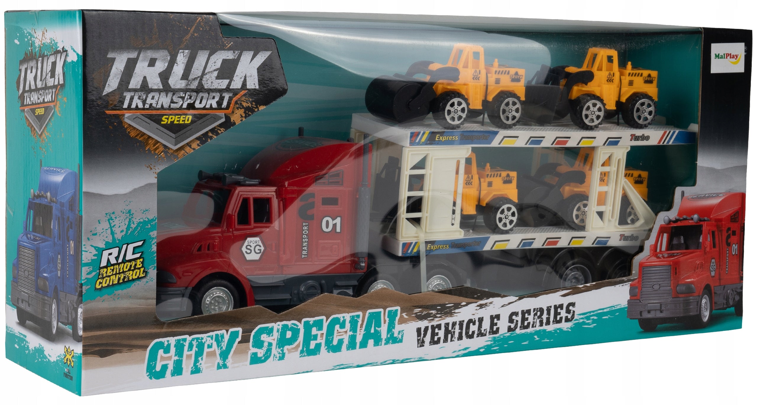 Nuotoliniu būdu valdomas žaislinis vilkikas su priekaba ir statybos transporto priemonėmis