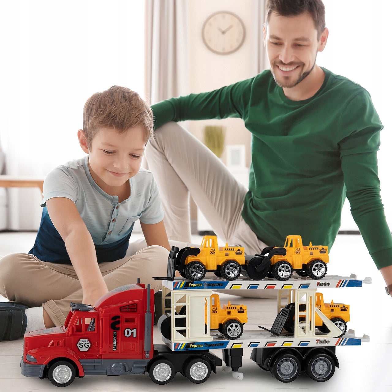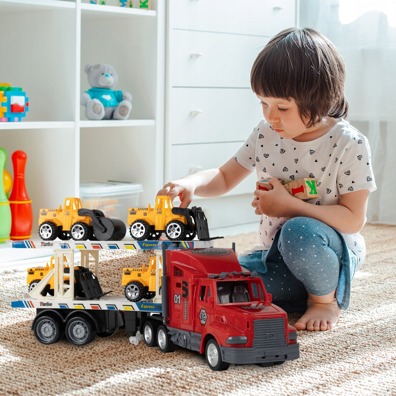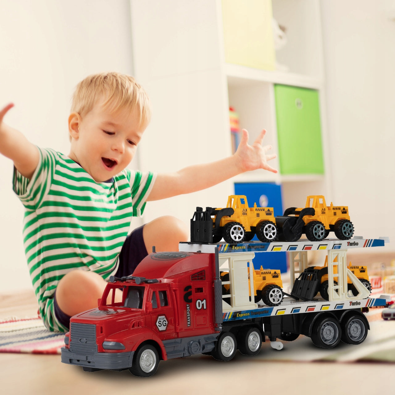 Leiskite savo vaikui pasinerti į dinamišką statybų pasaulį su šiuo išskirtiniu žaislų rinkiniu. Pagrindinis akcentas – tai didelis, nuotoliniu būdu valdomas vilkikas su atidaroma priekaba, galintis vežti net keturias mažesnes statybos transporto priemones: ekskavatorių, krautuvą, transporterį ir savivartį. Kiekviena transporto priemonė yra atidžiai modeliuojama, atspindint tikrųjų statybų technikos bruožus, todėl žaidimas tampa dar realesnis ir įtraukiantis. Šis žaislas ne tik linksmina, bet ir padeda vaikams pažinti įvairias transporto rūšis ir jų funkcijas.