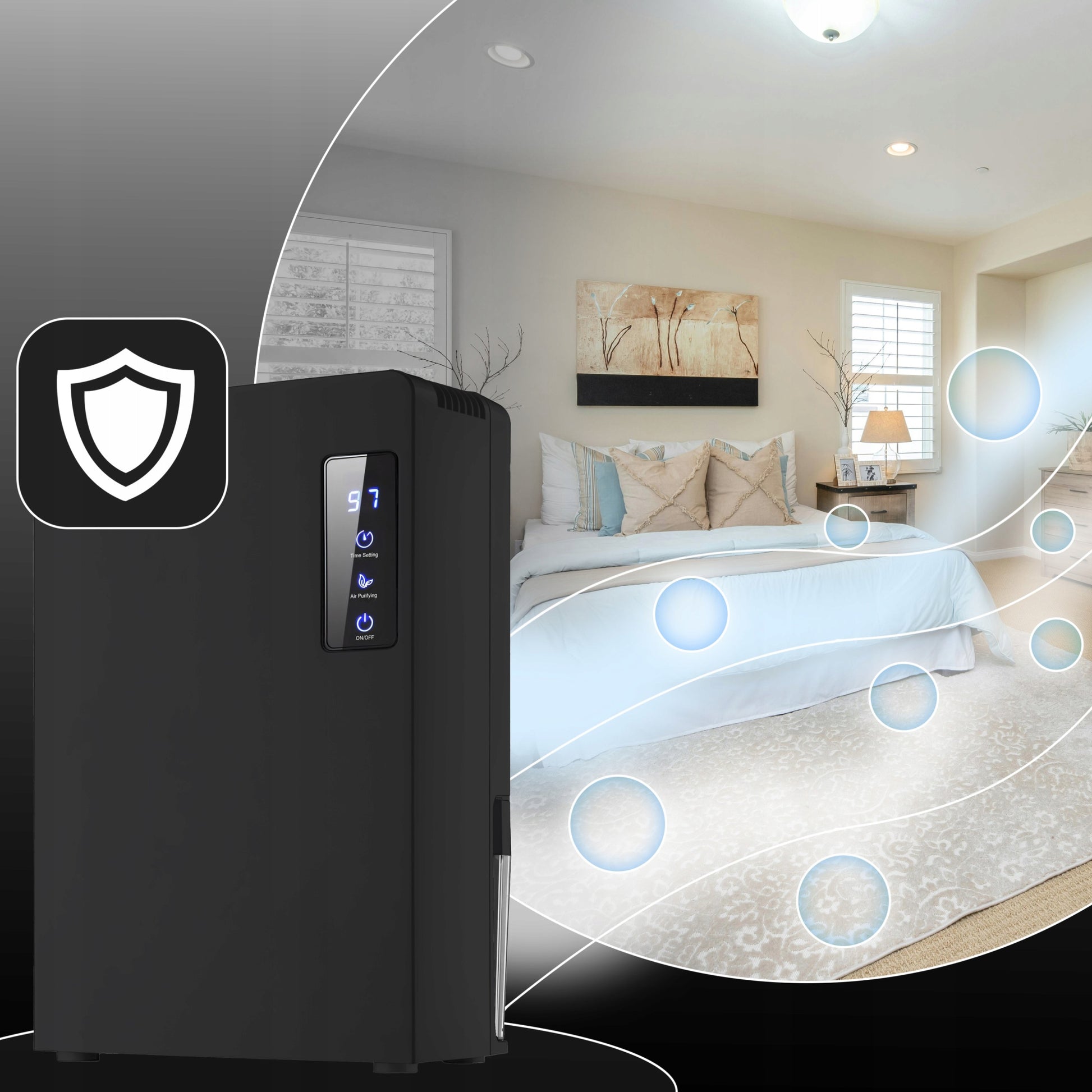 Šis pažangus oro sausintuvas sukurtas spręsti įsisenėjusią drėgmės problemą Jūsų namuose. Jis veikia itin efektyviai, gebėdamas pašalinti iki 600 ml vandens per parą esant optimalioms sąlygoms (30°C ir 85% santykinė drėgmė). Tai reiškia, kad greitai sumažinsite oro drėgnumą, užkirsite kelią kondensacijai ant langų ir sienų, bei sukursite sveikesnę ir malonesnę aplinką. Prietaisas taip pat neutralizuoja drėgmės sukeltus nemalonius kvapus, palikdamas orą gaivų ir švarų. Jame integruota UV valymo funkcija su titano dioksidu papildomai naikina bakterijas ir virusus, užtikrindama aukščiausią oro kokybę.