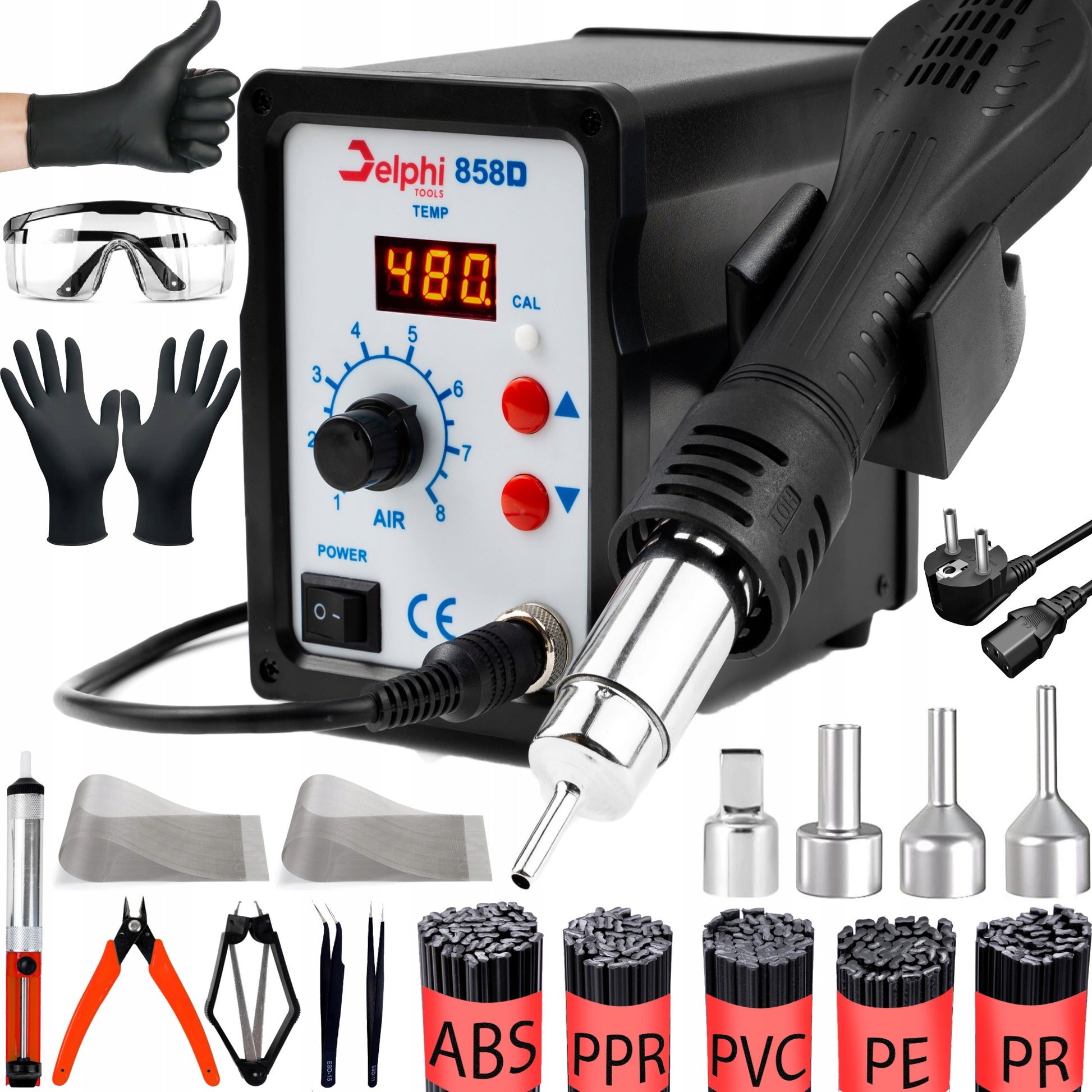Plastiko suvirinimo stotelė Delphi Tools 858D su karšto oro lituokliu, 500 g plastiko rišikliu ir pilnu priedų komplektu