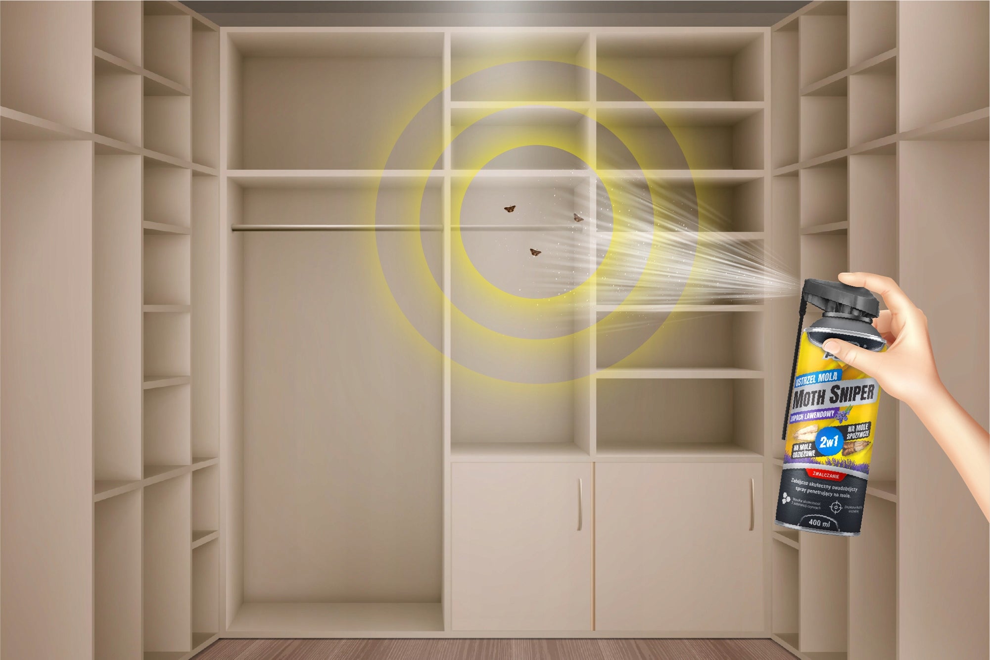 Papurkštas "Moth Sniper NO PEST®" aerozolis sukuria aktyvų insekticidinį sluoksnį. Moliams ir jų lervoms, kurie liečiasi su apdorotu paviršiumi, veikliosios medžiagos pradeda veikti jau po 15 minučių nuo kontakto. Unikalus siauras purkštukas leidžia pasiekti net pačias sunkiausiai prieinamas vietas – po lentynomis, už apvadų ar spintelių užkampiuose, kur moliai dažniausiai slepiasi ir veisiasi. Šis preparatas yra patogus naudoti, paruoštas iš karto pritaikyti, todėl galite greitai ir veiksmingai spręsti molių problemą.