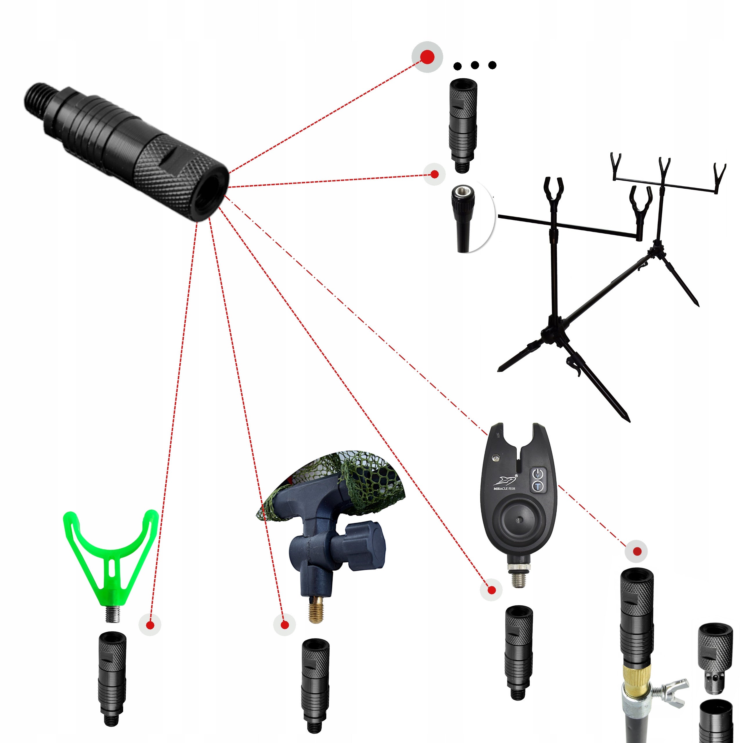 Suprantame, kokia svarbi yra greita ir efektyvi įrangos pakeitimo galimybė žvejojant. Todėl mūsų rinkinyje rasite tris universalias greito atjungimo jungtis. Jos leidžia akimirksniu pritvirtinti ar nuimti tokius priedus kaip signalizatoriai, meškerių laikikliai (šakutės), tinklai ar kiti įrankiai, turintys standartinį sriegį. Ši funkcija ne tik taupo laiką, bet ir leidžia greitai adaptuotis prie besikeičiančių žvejybos sąlygų ar poreikių, pavyzdžiui, greitai pakeisti vizualinį signalizatorių į guminę meškerės atramą. Jungtys pagamintos iš aukštos kokybės medžiagų, užtikrinančių patikimą ir stabilų priedų tvirtinimą.