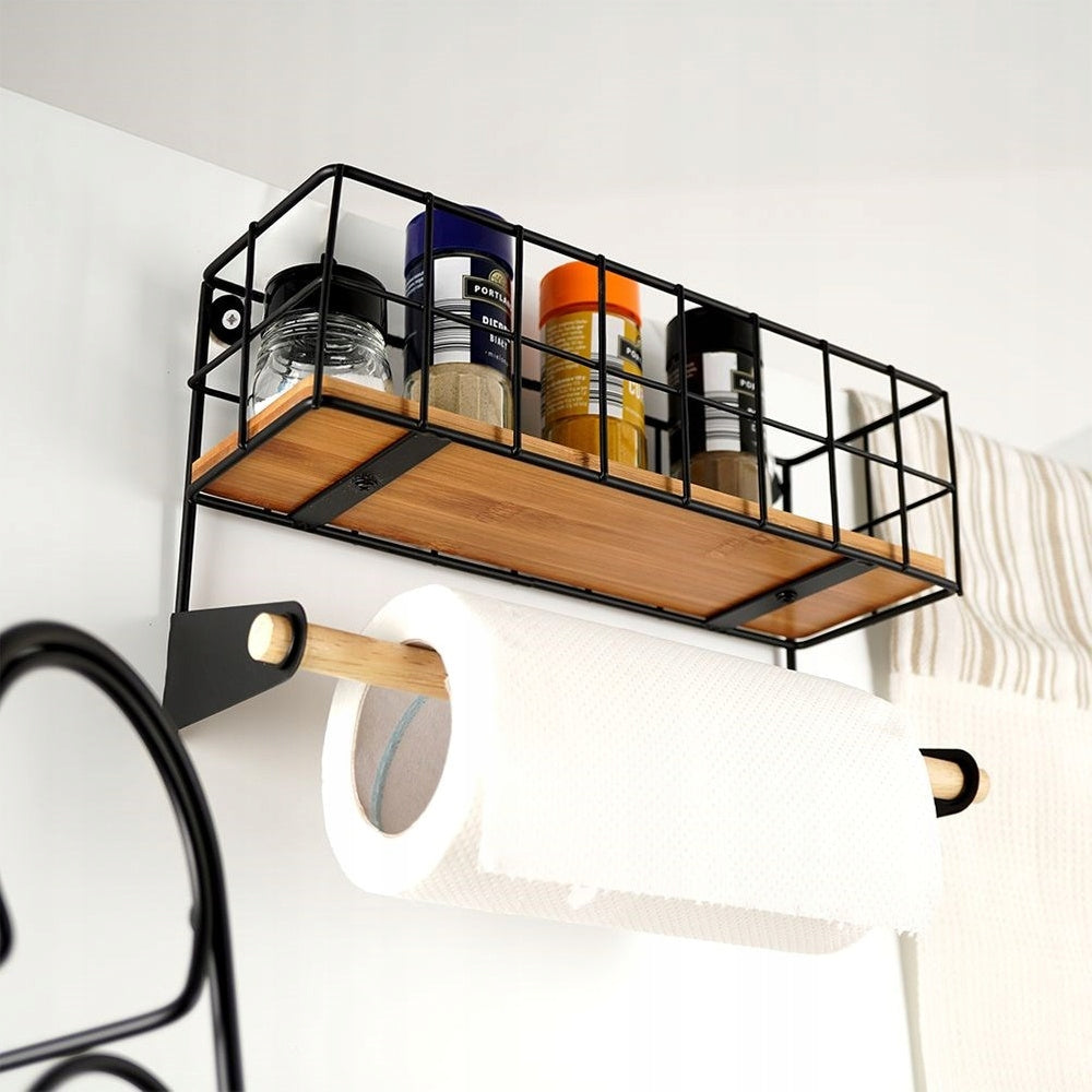 Sieninis laikiklis popieriniam rankšluosčiui, juodas metalas su bambuko lentynėle