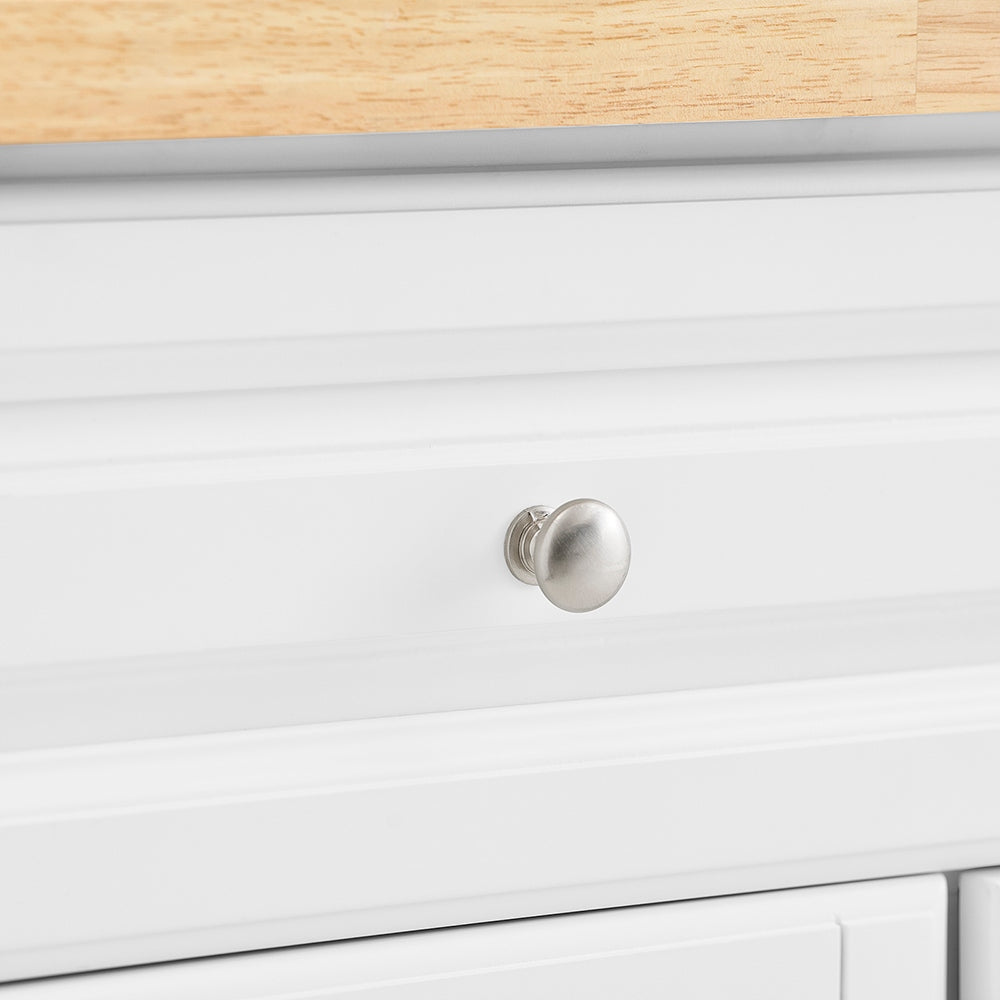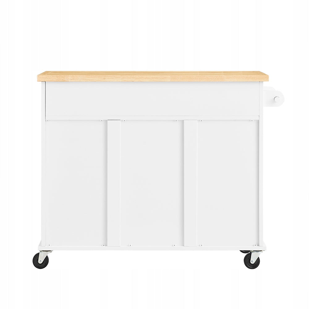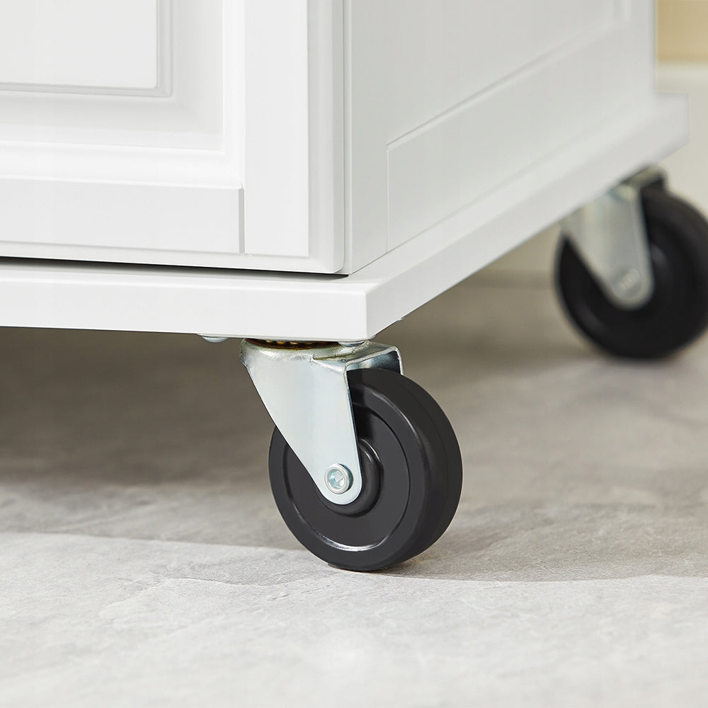 SoBuy virtuvės sala FKW100-WN pasižymi tvirta konstrukcija, pagaminta iš aukštos kokybės MDF plokštės, kuri užtikrina ilgaamžiškumą ir atsparumą kasdieniam naudojimui. Stalviršis pagamintas iš tvirto kaučiukmedžio medienos, suteikiančio natūralumo ir papildomo patvarumo. Paviršius padengtas baltos spalvos blizgiu, kuris ne tik atrodo estetiškai, bet ir yra lengvai valomas bei atsparus drėgmei. Baldas turi keturis didelius, stabilius guminius ratukus, kurie leidžia lengvai jį perkelti į norimą vietą. Du iš šių ratukų turi stabdžius, užtikrinančius, kad spintelė liktų fiksuota naudojimo metu. Tai suteikia mobilumo ir saugumo.