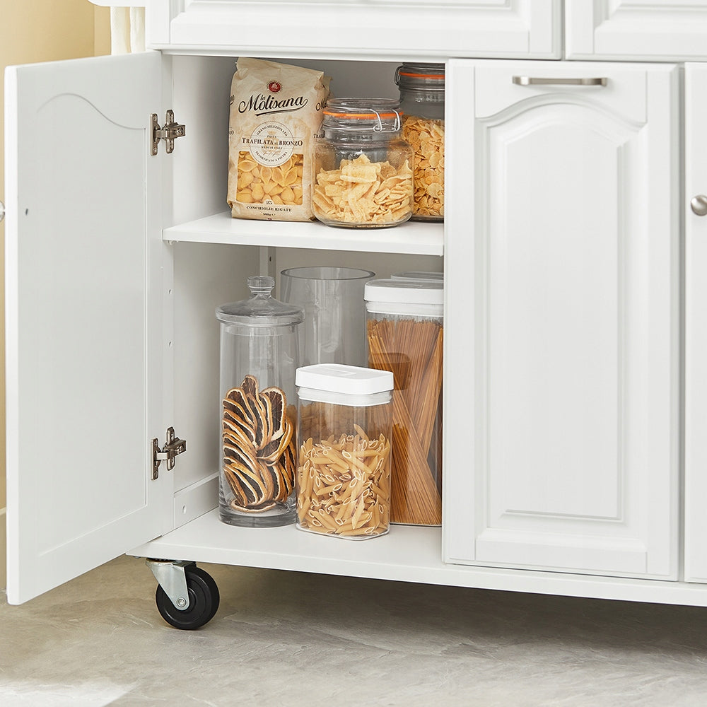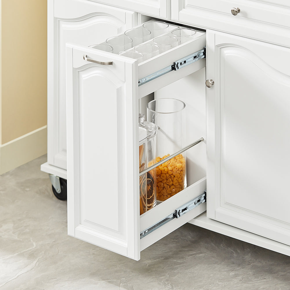 Atnaujinkite savo virtuvę su šiuo prabangiu SoBuy virtuvės vežimėliu, kuris puikiai derina stilių, funkcionalumą ir patogumą. Ši balta, apatinė virtuvės spintelė su subtiliu blizgesiu taps ne tik nepakeičiama pagalbininke, bet ir stilingu interjero akcentu, derančiu su moderniais dizainais ir šviesiais virtuvės stalviršiais. Ji suteikia daugybę vietos Jūsų indams, stalo įrankiams, prieskoniams ir kitiems virtuvės aksesuarams laikyti, padedant palaikyti nepriekaištingą tvarką virtuvėje. Dėl savo universalaus dizaino ir praktiškų sprendimų, ši spintelė idealiai tinka kaip virtuvės sala arba papildomas darbinis paviršius.