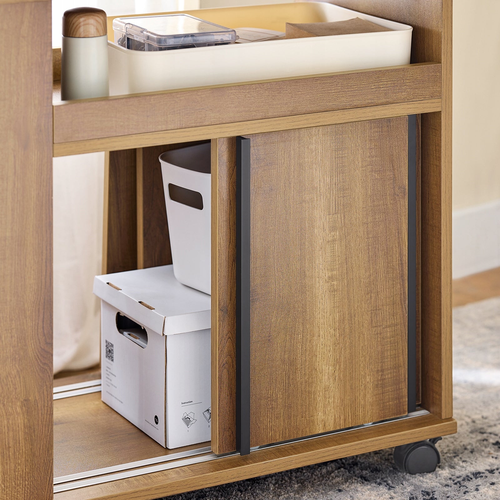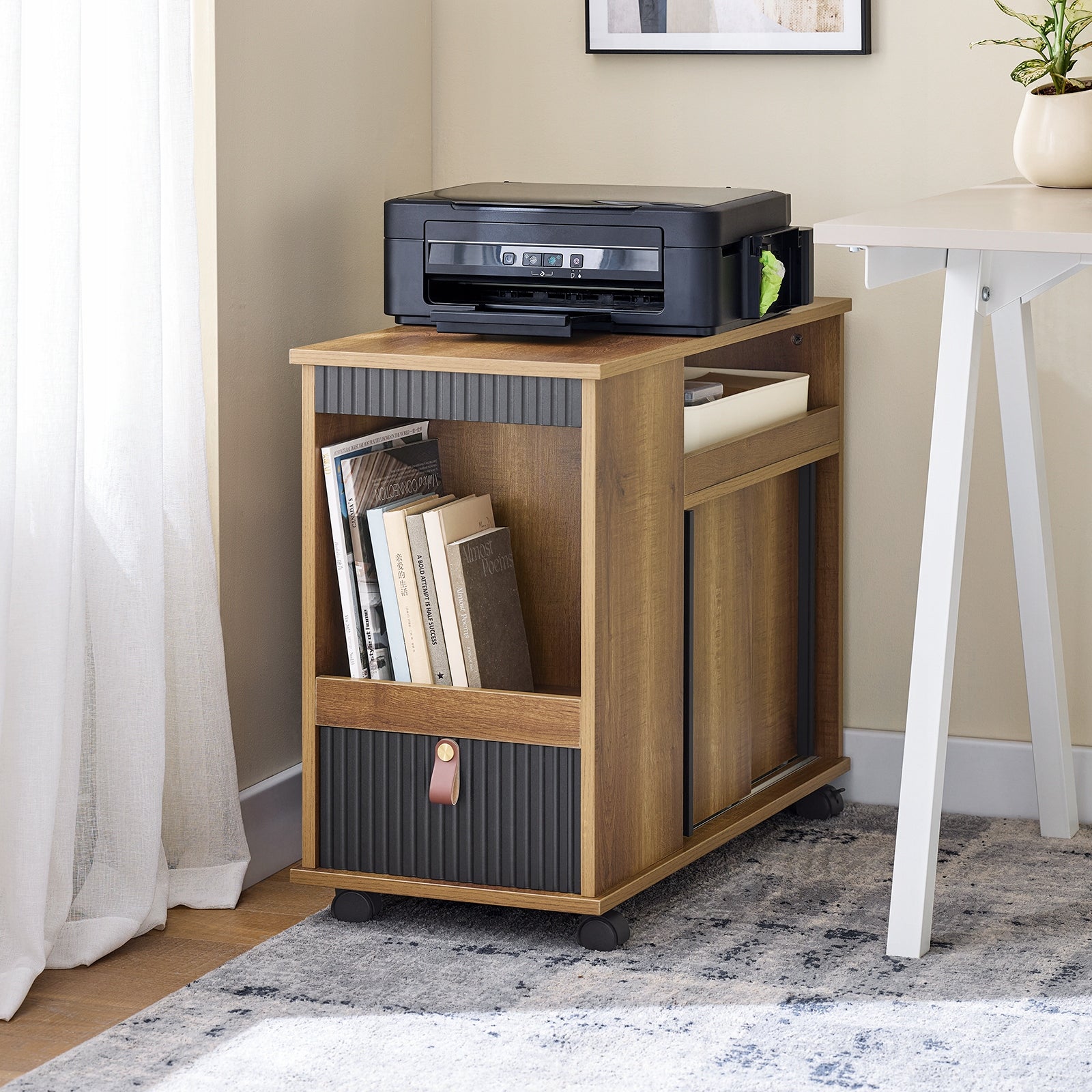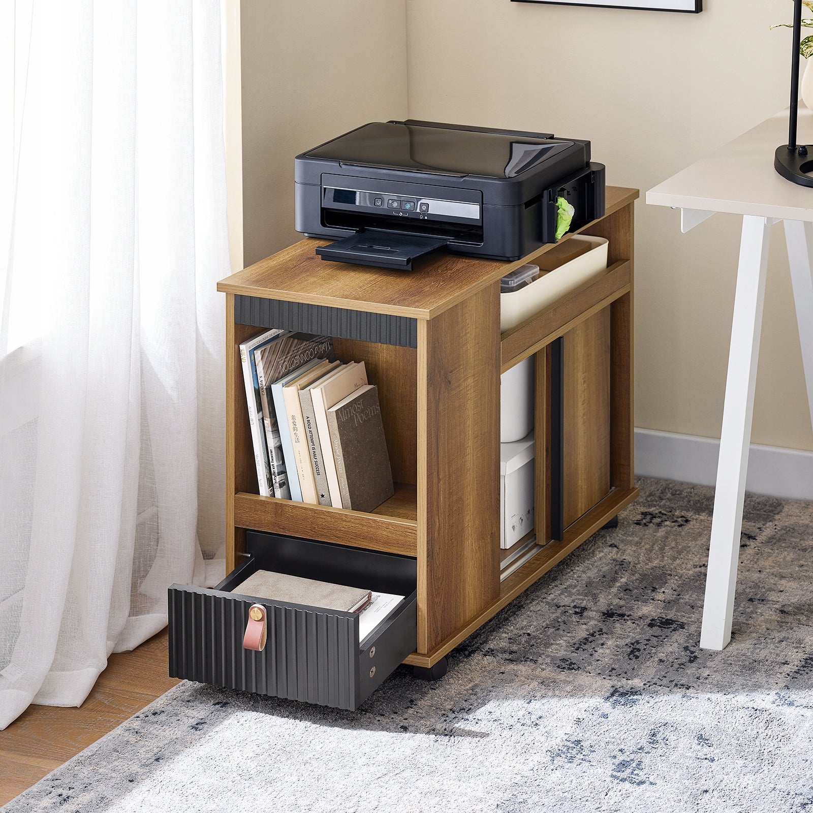 Šis staliukas sukurtas taip, kad maksimaliai palengvintų Jūsų kasdienybę. Jis ne tik atrodo stilingai, bet ir siūlo apgalvotus laikymo sprendimus. Vieną daiktų skyrių sudaro talpi ir sklandžiai veikianti stalčius, suprojektuotas taip, kad kiekvienas daiktas rastų savo vietą ir būtų lengvai pasiekiamas. Be to, staliukas turi uždarą spintelę su durelėmis, kuri suteikia papildomos erdvės smulkiems daiktams, knygoms ar kitiems svarbiems daiktams paslėpti, išlaikant tvarkingą ir estetišką vaizdą.
