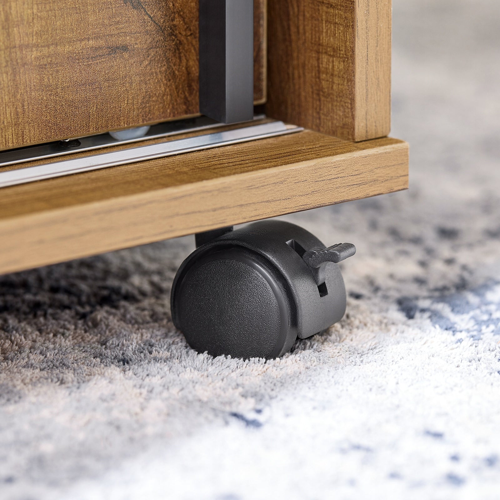 Viena iš pagrindinių šio staliuko savybių yra jo mobilumas. Jis aprūpintas keturiais universaliais ir lanksčiais ratukais, kurie sukasi 360 laipsnių kampu. Šie ratukai užtikrina tylų ir sklandų staliuko judėjimą, visiškai nepažeidžiant grindų dangos. Siekiant didesnio saugumo ir stabilumo, du iš ratukų turi patikimus stabdžius. Juos aktyvuoti tereikia vieno mygtuko paspaudimo, todėl staliuką galite lengvai užfiksuoti norimoje vietoje, užkertant kelią jo netyčiniam paslydimui ar judėjimui.