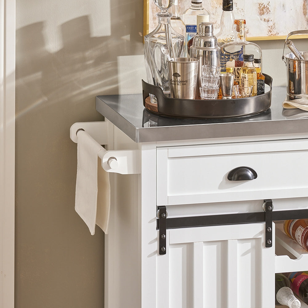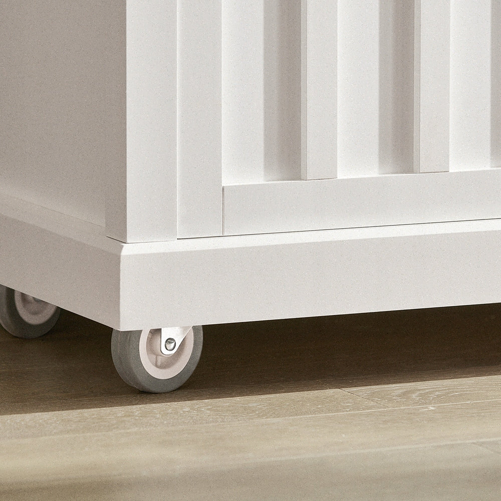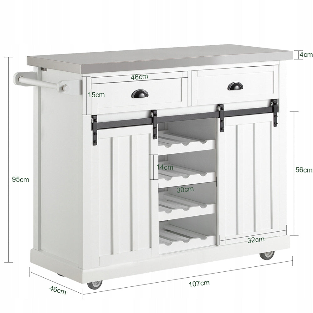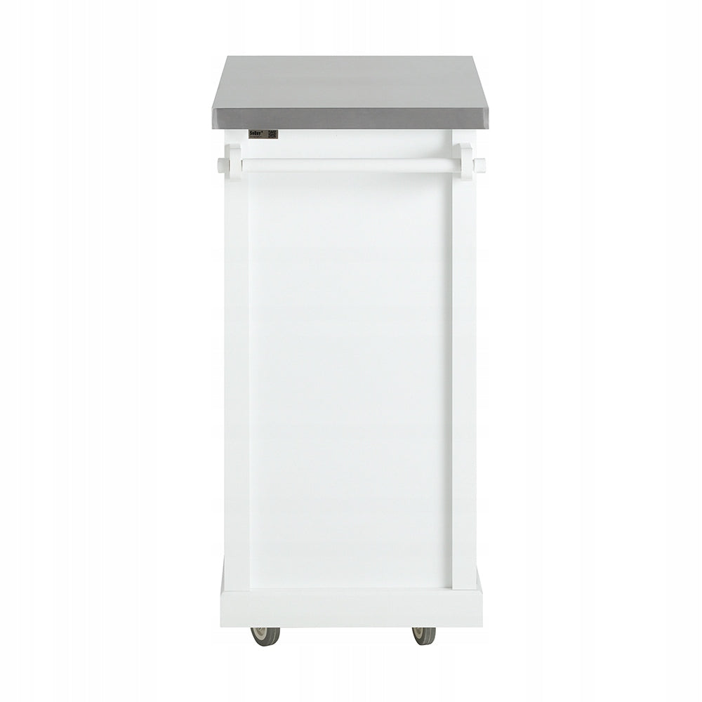 Ši virtuvės spintelė pasižymi itin apgalvota konstrukcija, orientuota į maksimalų patogumą ir talpumą. Nerūdijančio plieno stalviršis yra patvarus ir lengvai prižiūrimas, suteikia papildomą darbo paviršių ruošiant maistą. Blizgi balta korpuso apdaila su kontrastingomis juodomis rankenėlėmis sukuria madingą ir nesenstantį vaizdą. Spintelės mobilumas, užtikrintas keturių ratukų, leidžia lengvai keisti jos vietą, pritaikant prie jūsų poreikių – ji gali tapti tiek pagrindine virtuvės spintele, tiek patogiu padavimui skirta paslauga.