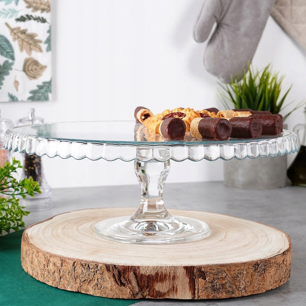 Paverskite savo stalą tikru meno kūriniu su šia išskirtine stikline lėkšte ant kojelės. Jos skersmuo – 32 cm, o elegantiškos, banguotos briaunos suteikia jai ypatingo žavesio. Pagaminta iš aukščiausios kokybės skaidraus stiklo, ji ne tik praktiška, bet ir puikiai papuoš bet kokią šventę ar kasdienį susibūrimą. Ši lėkštė yra puikus pasirinkimas norint efektingai patiekti tortus, pyragus, keksiukus, vaisius ar įvairius užkandžius, džiuginant tiek akis, tiek gomurį.