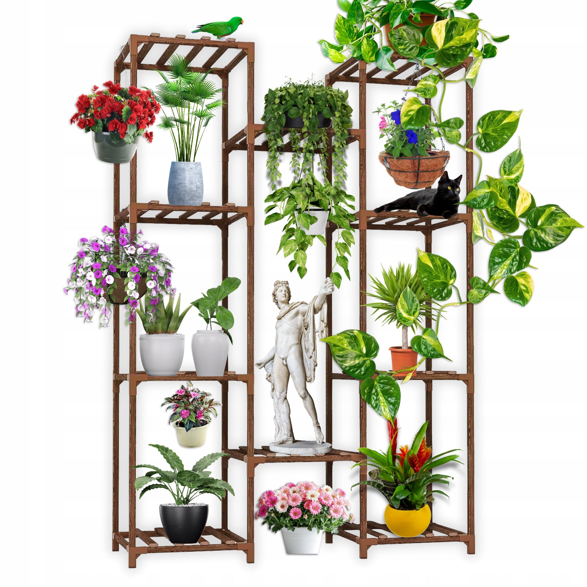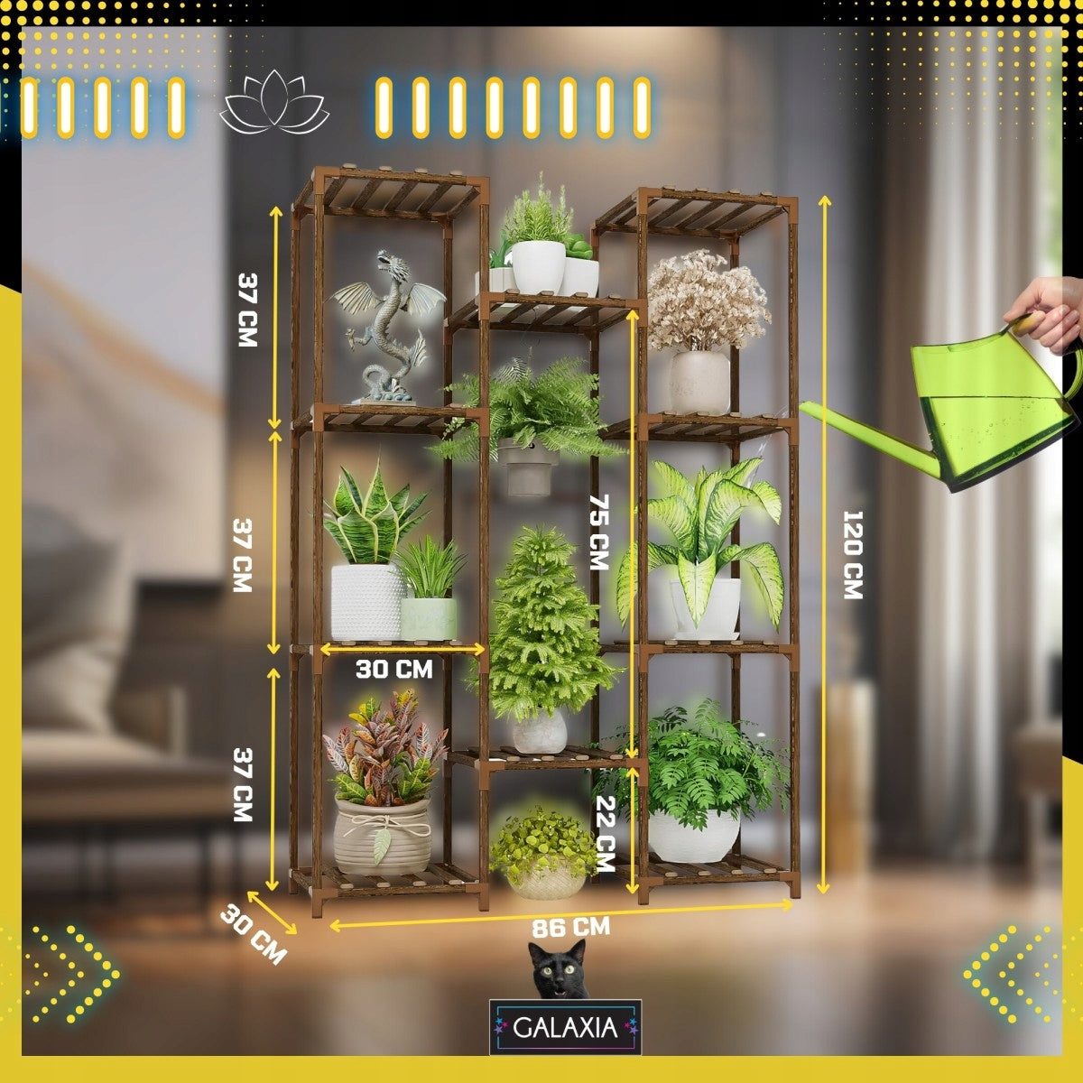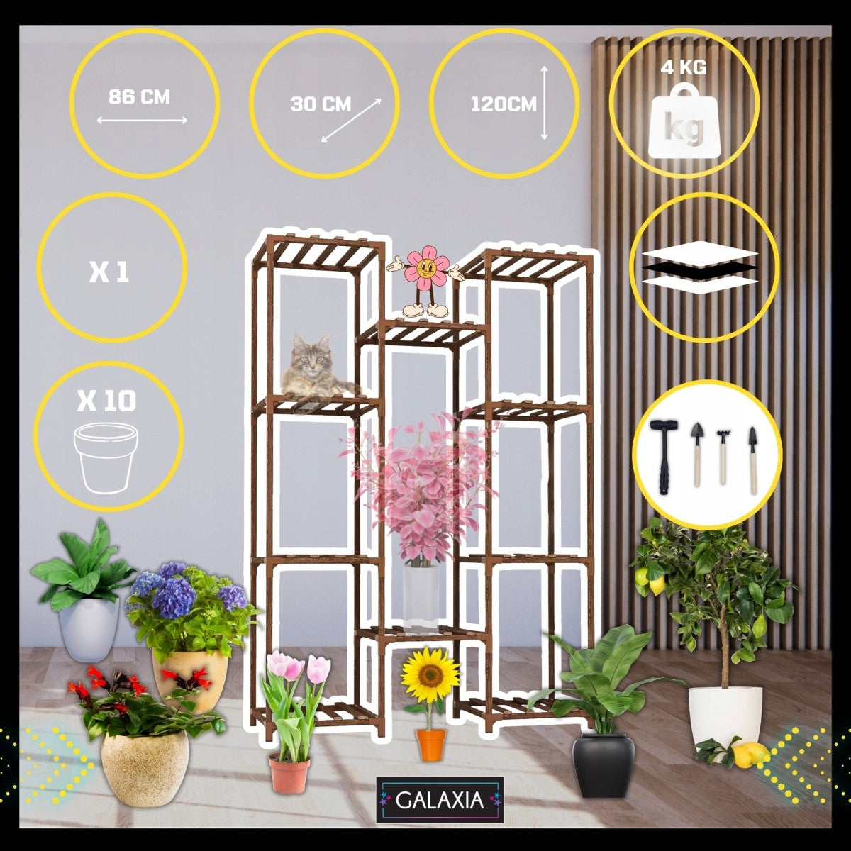 Šis daugiaaukštis stovas sukurtas atsižvelgiant į augalų poreikius ir jūsų estetiką. 10 skirtingų aukščių ir dydžių lentynų suteikia maksimalią erdvę jūsų augalų kolekcijai. Kiekvienas augalas gaus pakankamai saulės šviesos ir oro, o asimetriškas dizainas suteikia šiuolaikiškumo. Tai ne tik stovas gėlėms – tai universalus baldas, kuris gali tapti gražiu knygų, dekoracijų ar kitų smulkių daiktų laikikliu, papildančiu jūsų interjerą ar eksterjerą.