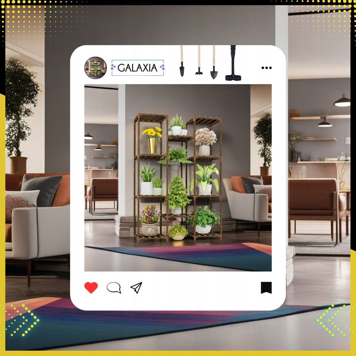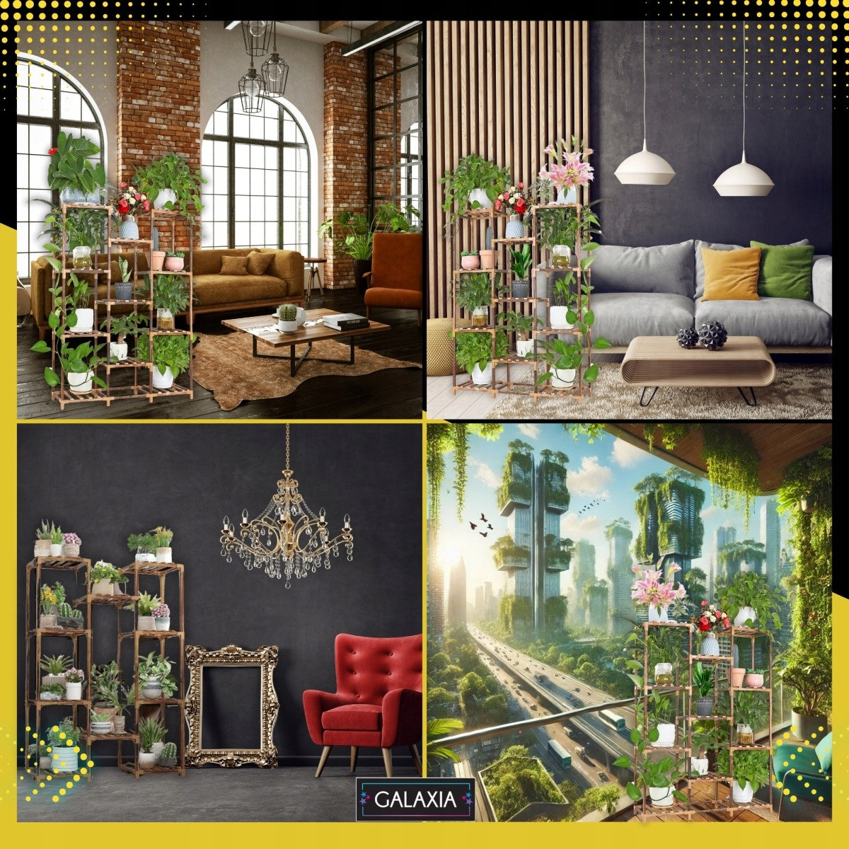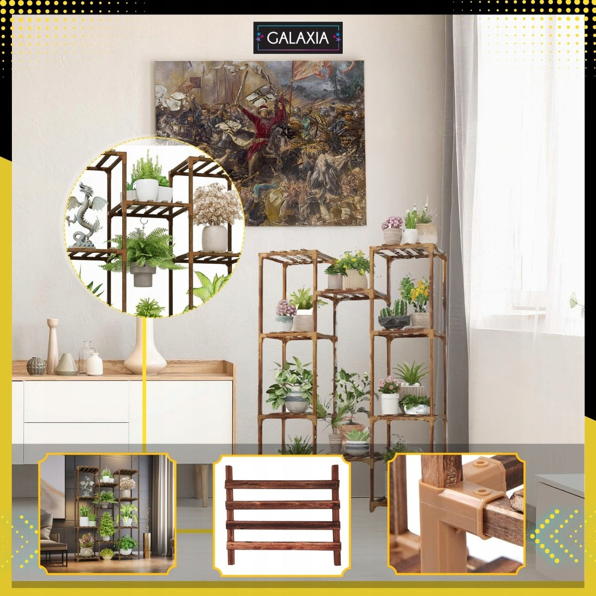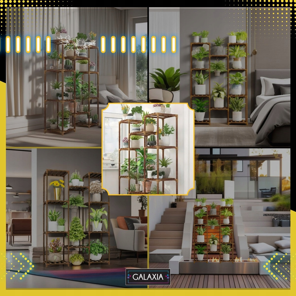 Šis daugiaaukštis stovas yra nepaprastai universalus. Jis puikiai tinka ne tik gėlėms ir augalams, bet ir gali būti naudojamas kaip stilinga lentyna knygoms, dekoratyviniams daiktams, suvenyrams ar net kaip avalynės organizatorius prieškambaryje. Jo modernus, tačiau natūralus dizainas lengvai dera su įvairiais interjero stiliais – nuo skandinaviško ir boho iki modernaus lofto ar klasikinio. Puikiai atrodys svetainėje, biure, miegamajame, balkone, terasoje ar sode.