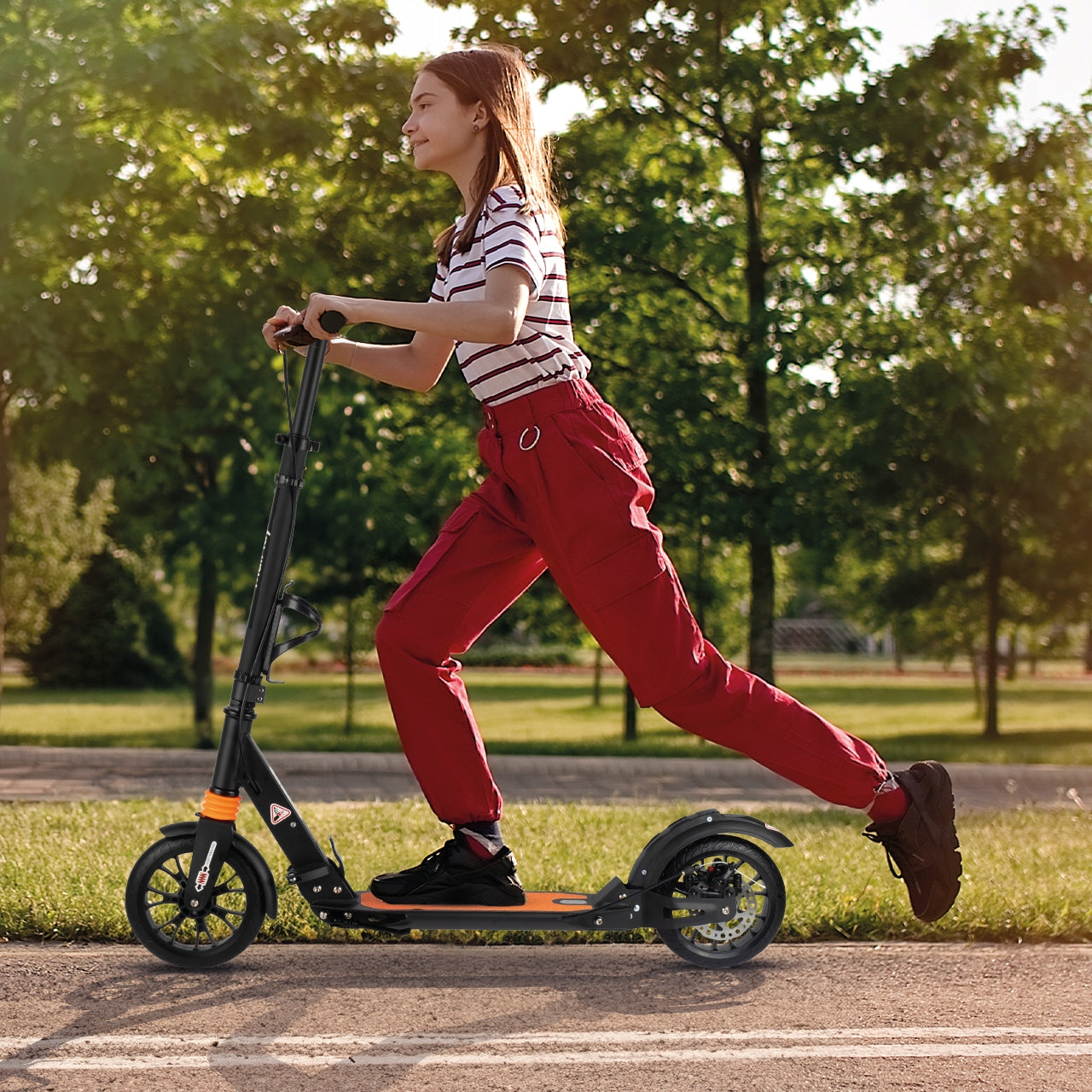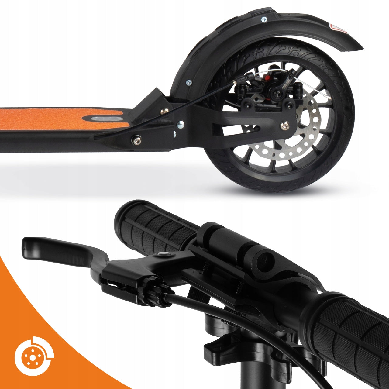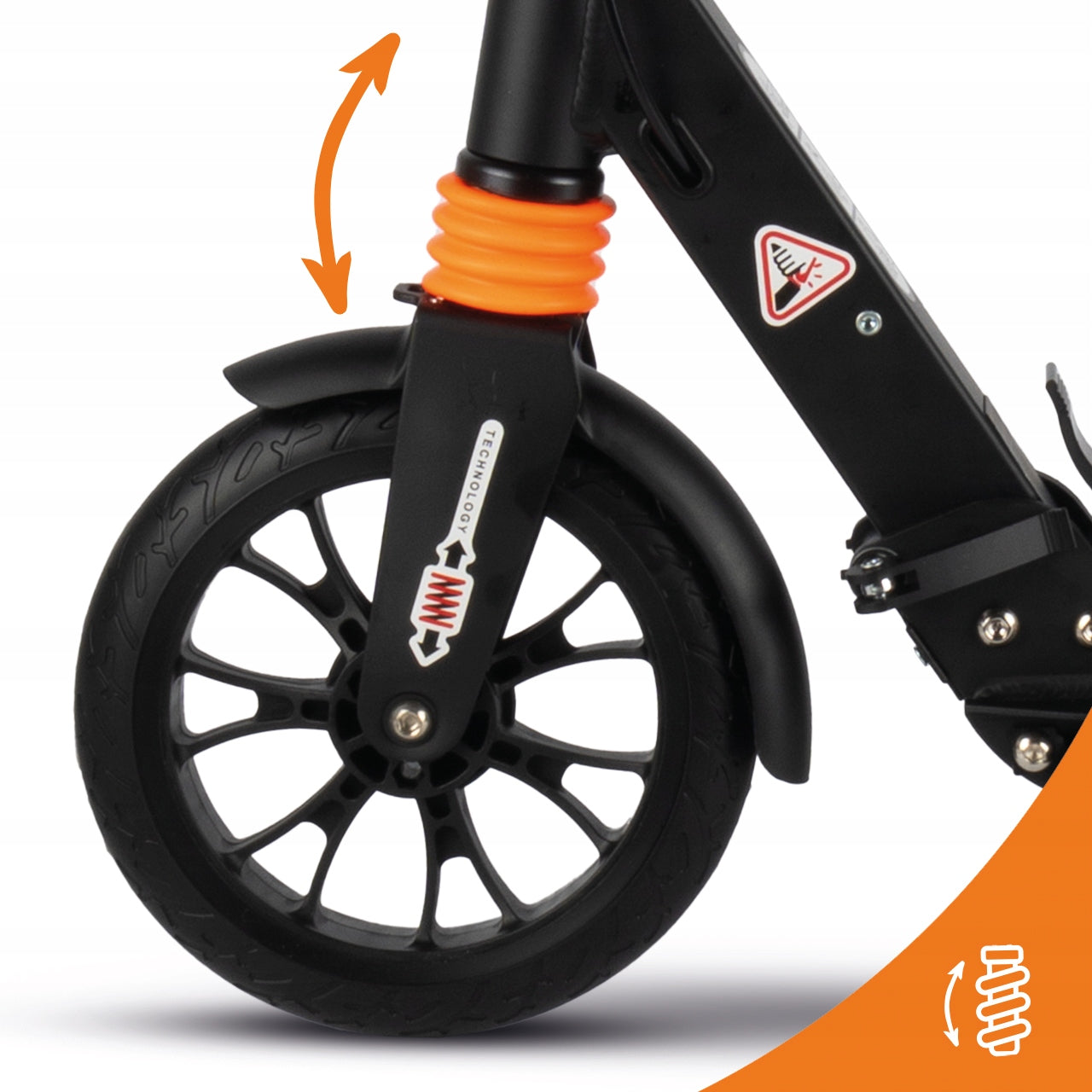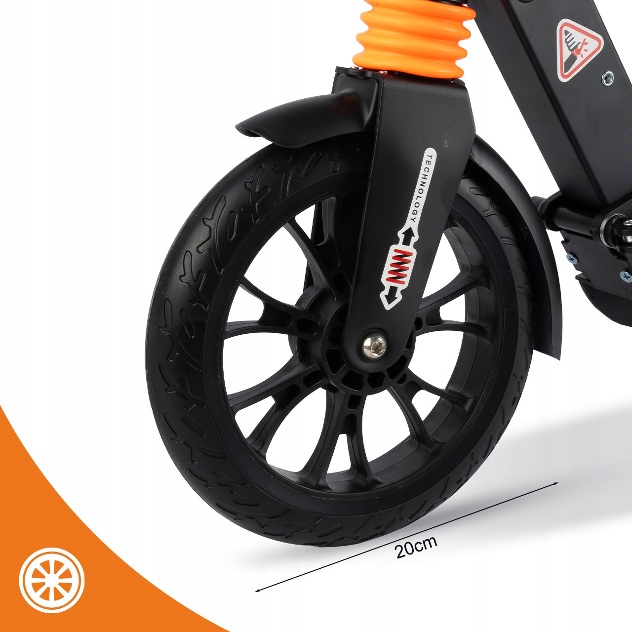 Pamirškite nemalonius vibracijų jausmus! Mūsų paspirtukas aprūpintas pažangia priekinės ir galinės ašies amortizacijos sistema, kuri efektyviai sugeria smūgius ir nelygumus. Tai reiškia, kad galėsite mėgautis sklandžia ir patogia kelione net važiuodami per šaligatvio plyteles, duobes ar kitus netolygumus. Dideli, 200 mm skersmens, guminiai ratai su ABEC-9 guoliais užtikrina puikų sukibimą su kelio danga ir stabilumą, o neslystanti platforma suteikia papildomo saugumo ir pasitikėjimo kiekvieno pasivažinėjimo metu. Tvirtas aliuminio rėmas atlaiko iki 100 kg svorį, todėl šis paspirtukas tinkamas tiek paaugliams, tiek suaugusiems.