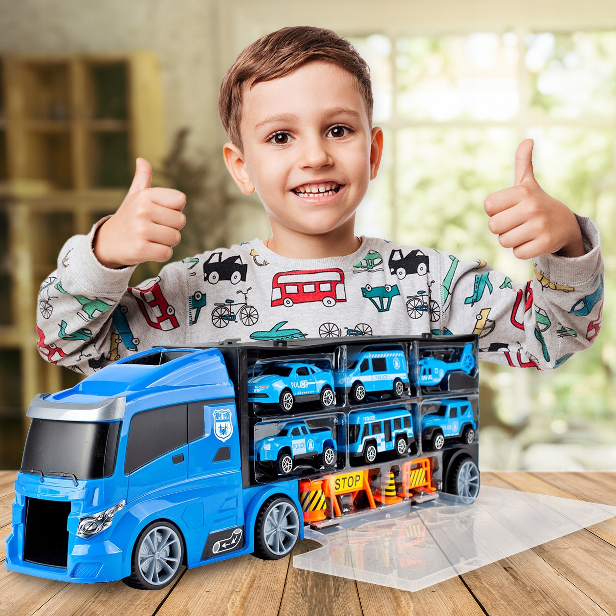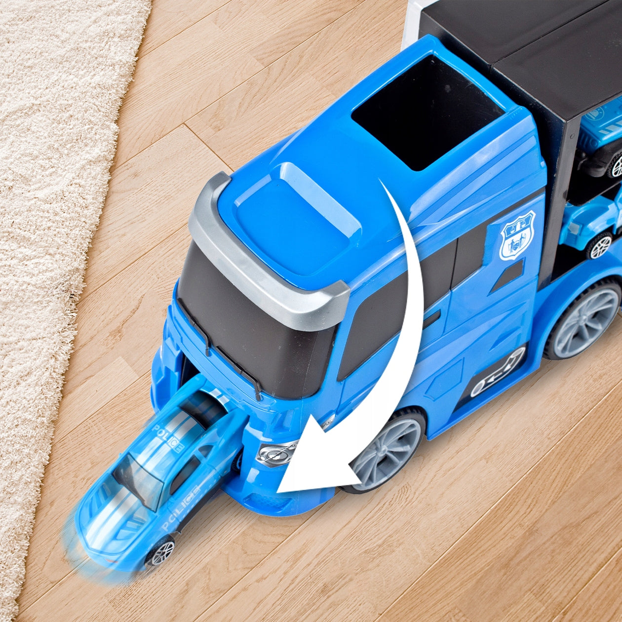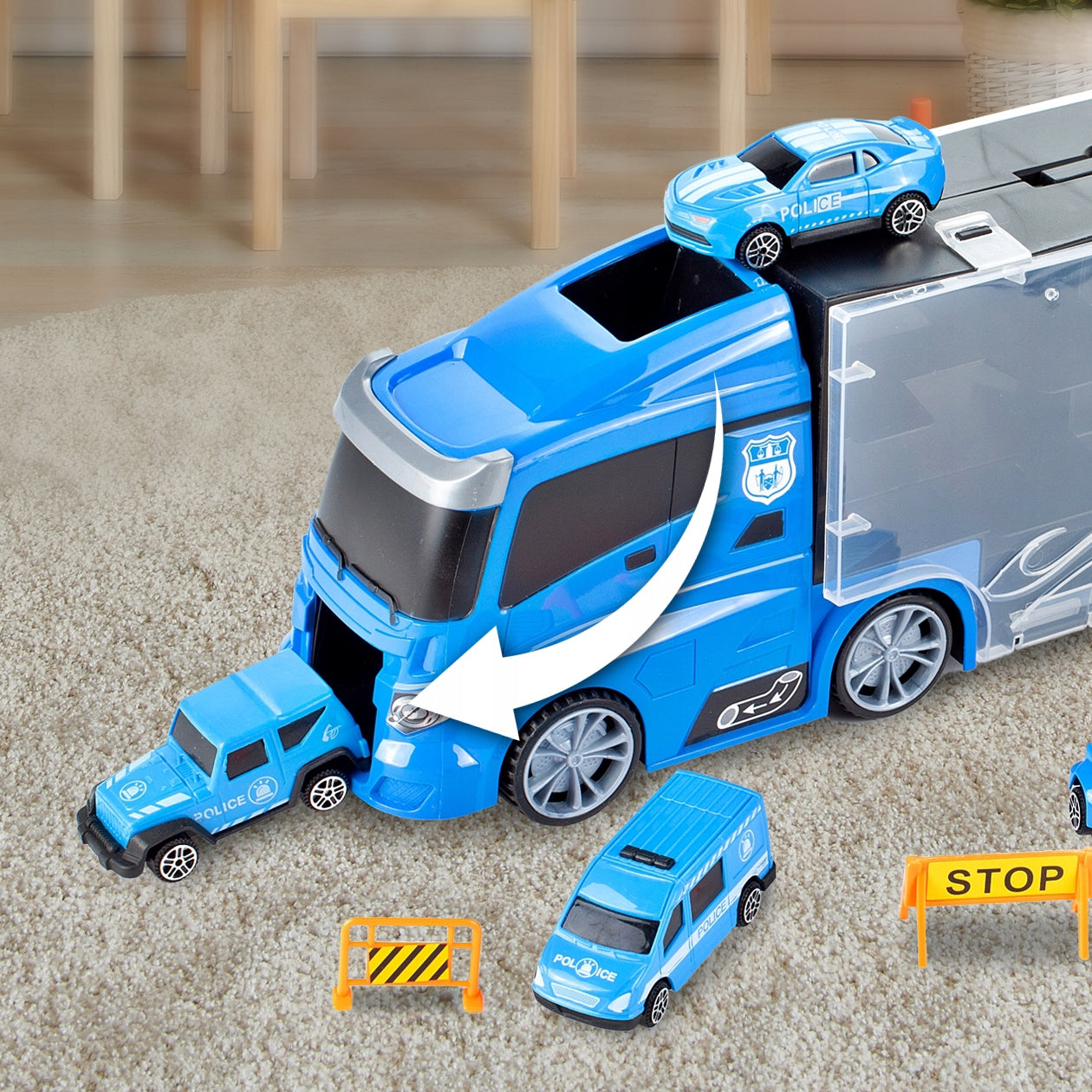 Šis žaislinis sunkvežimis yra kur kas daugiau nei paprastas automobilis – tai visa mobilioji policijos bazė, kurią galima vežiotis visur. Kai sunkvežimis atidaromas, atsiveria vidinis skyrius, kuriame telpa visi rinkinio elementai. Vienas iš priekio atidaromas skyrius tarnauja kaip automobilio paleidimo aikštelė, suteikdama dinamiškumo žaidimui. Detali gamyba ir aukštos kokybės plastikas užtikrina žaislo ilgaamžiškumą ir saugumą. Vaikai galės kurti savo scenarijus, gaudyti „nusikaltėlius“ ir tvarkyti miestą su šiuo daugiafunkciu žaislu.