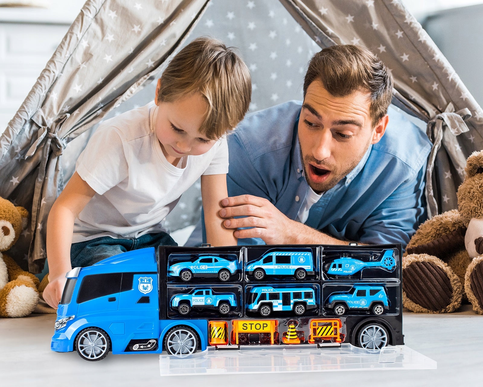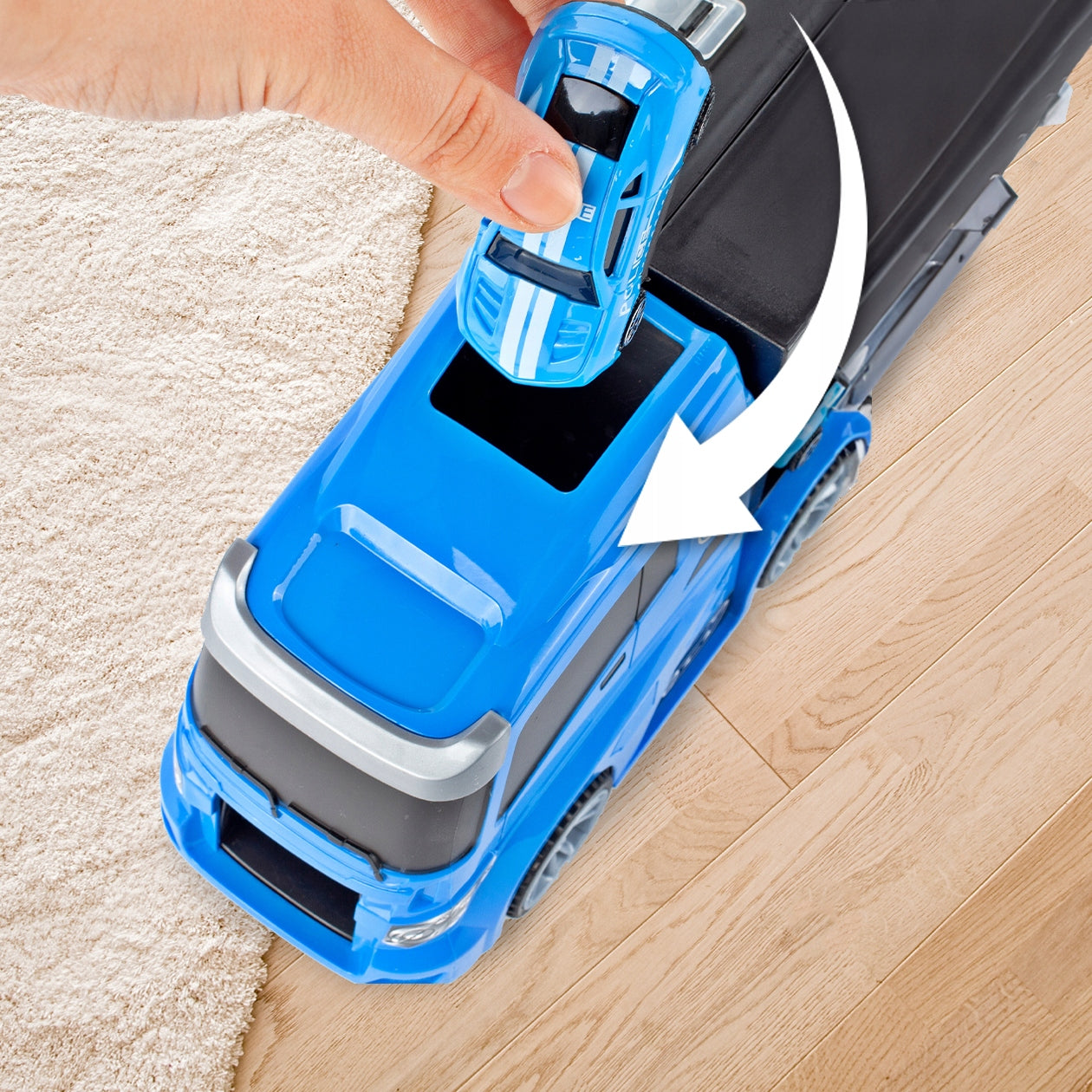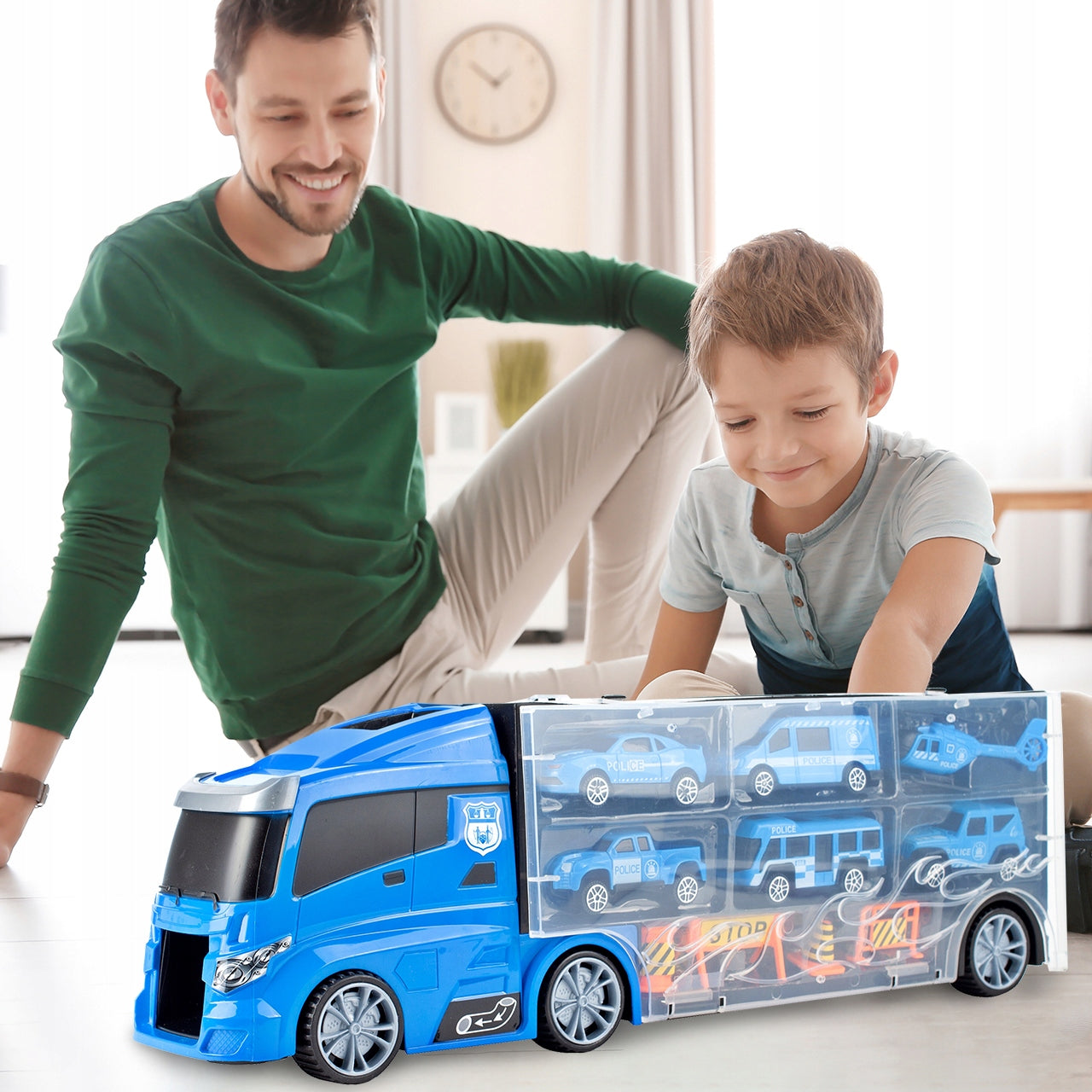 Šis žaislinis sunkvežimis yra kur kas daugiau nei paprastas automobilis – tai visa mobilioji policijos bazė, kurią galima vežiotis visur. Kai sunkvežimis atidaromas, atsiveria vidinis skyrius, kuriame telpa visi rinkinio elementai. Vienas iš priekio atidaromas skyrius tarnauja kaip automobilio paleidimo aikštelė, suteikdama dinamiškumo žaidimui. Detali gamyba ir aukštos kokybės plastikas užtikrina žaislo ilgaamžiškumą ir saugumą. Vaikai galės kurti savo scenarijus, gaudyti „nusikaltėlius“ ir tvarkyti miestą su šiuo daugiafunkciu žaislu.