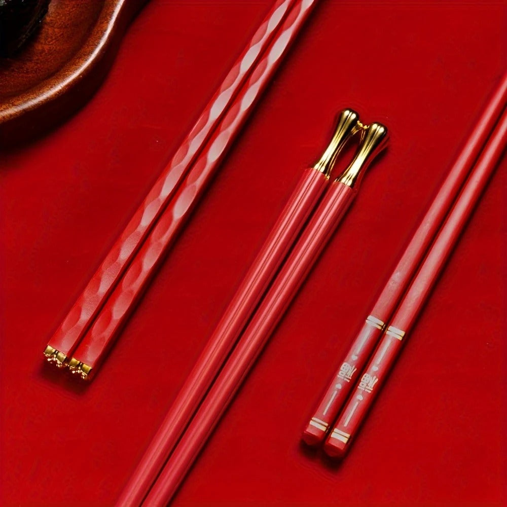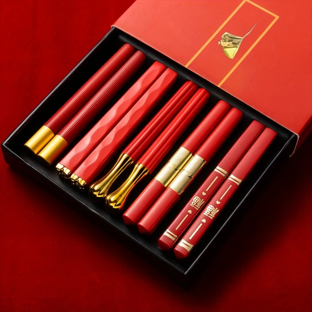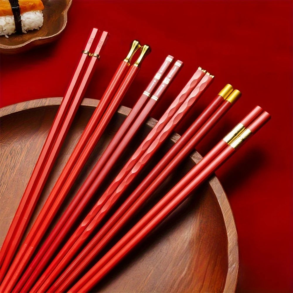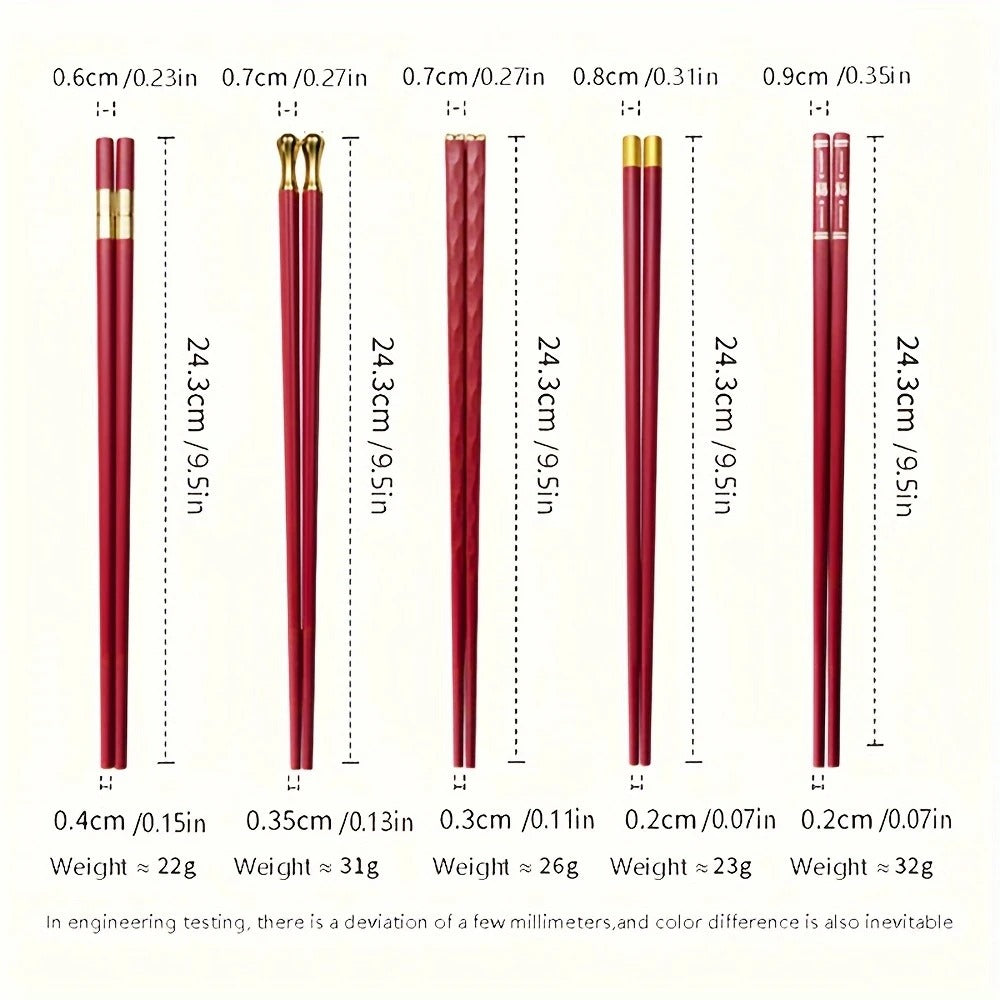 Sushi Lazdelės – 5 Poros Daugkartinio Naudojimo, 24,3 cm, Stiklo Pluošto, Raudonos su Aukso Imitacija, Japoniško Stiliaus