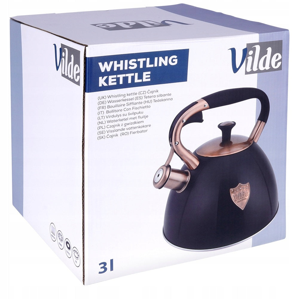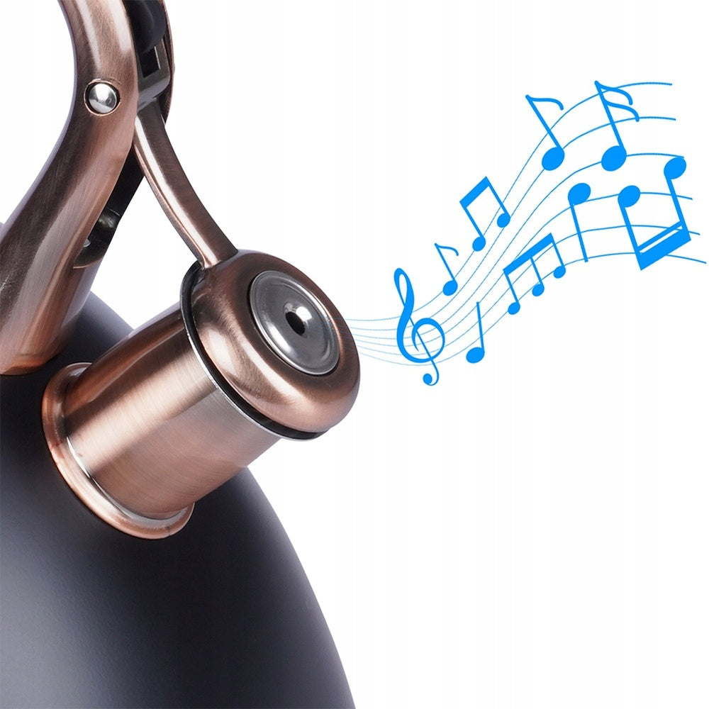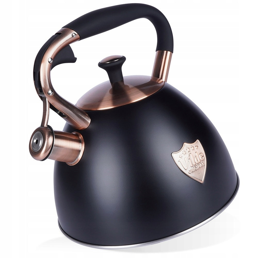 Pristatome klasikinį, stilingą virdulį su švilpuku, sukurtą patogiam vandens virimui bet kokioje virtuvėje. Pagamintas iš aukščiausios kokybės nerūdijančio plieno, šis 3 litrų talpos virdulys derina ilgaamžiškumą ir eleganciją. Matinė juoda spalva su sendintais vario atspalviais suteikia jam unikalų, išraiškingą dizainą, kuris puikiai papildys tiek modernius, tiek klasikinius interjerus. Virdulys turi automatinį švilpuką, kuris aiškiai signalizuos užvirusį vandenį, bei nuimamą dangtelį, palengvinantį vandens papildymą. Ergonomiška „Soft Touch“ rankena užtikrina saugų ir patogų naudojimą, o specialiai sukurtas akuterminis dugnas leidžia greitai ir efektyviai įkaisti vandenį net ir ant žemos kaitlentės galios, taupant energiją.
