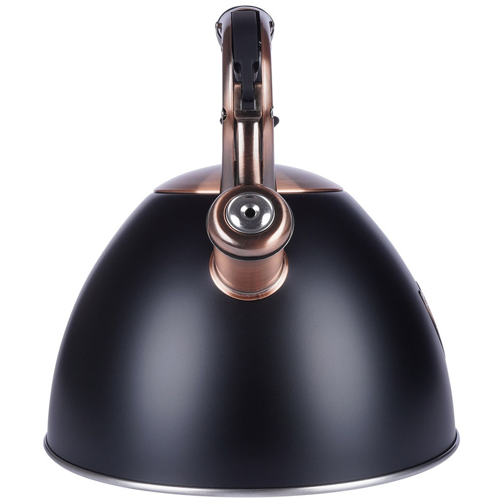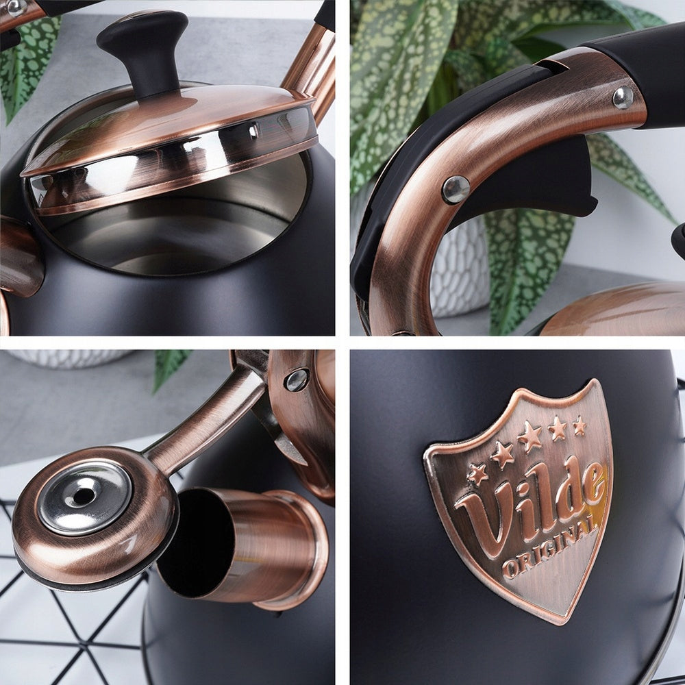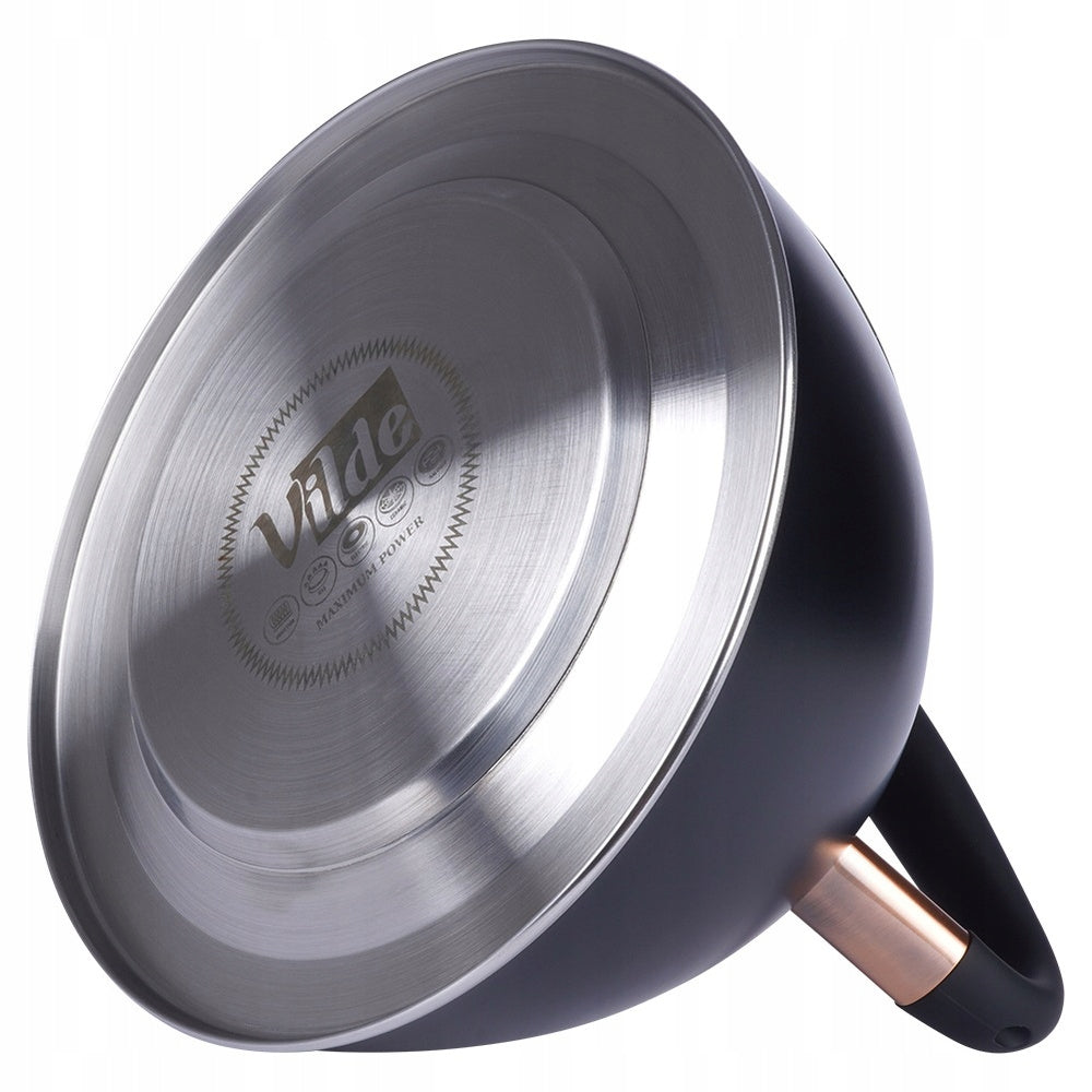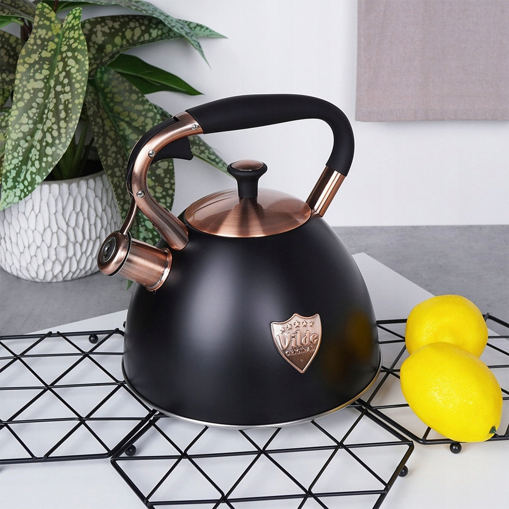 Pristatome klasikinį, stilingą virdulį su švilpuku, sukurtą patogiam vandens virimui bet kokioje virtuvėje. Pagamintas iš aukščiausios kokybės nerūdijančio plieno, šis 3 litrų talpos virdulys derina ilgaamžiškumą ir eleganciją. Matinė juoda spalva su sendintais vario atspalviais suteikia jam unikalų, išraiškingą dizainą, kuris puikiai papildys tiek modernius, tiek klasikinius interjerus. Virdulys turi automatinį švilpuką, kuris aiškiai signalizuos užvirusį vandenį, bei nuimamą dangtelį, palengvinantį vandens papildymą. Ergonomiška „Soft Touch“ rankena užtikrina saugų ir patogų naudojimą, o specialiai sukurtas akuterminis dugnas leidžia greitai ir efektyviai įkaisti vandenį net ir ant žemos kaitlentės galios, taupant energiją.