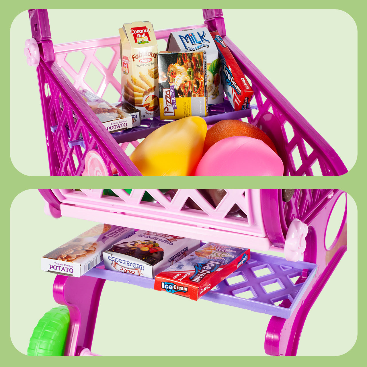 - Rožinis apsipirkimo vežimėlis su lentynėlėmis.