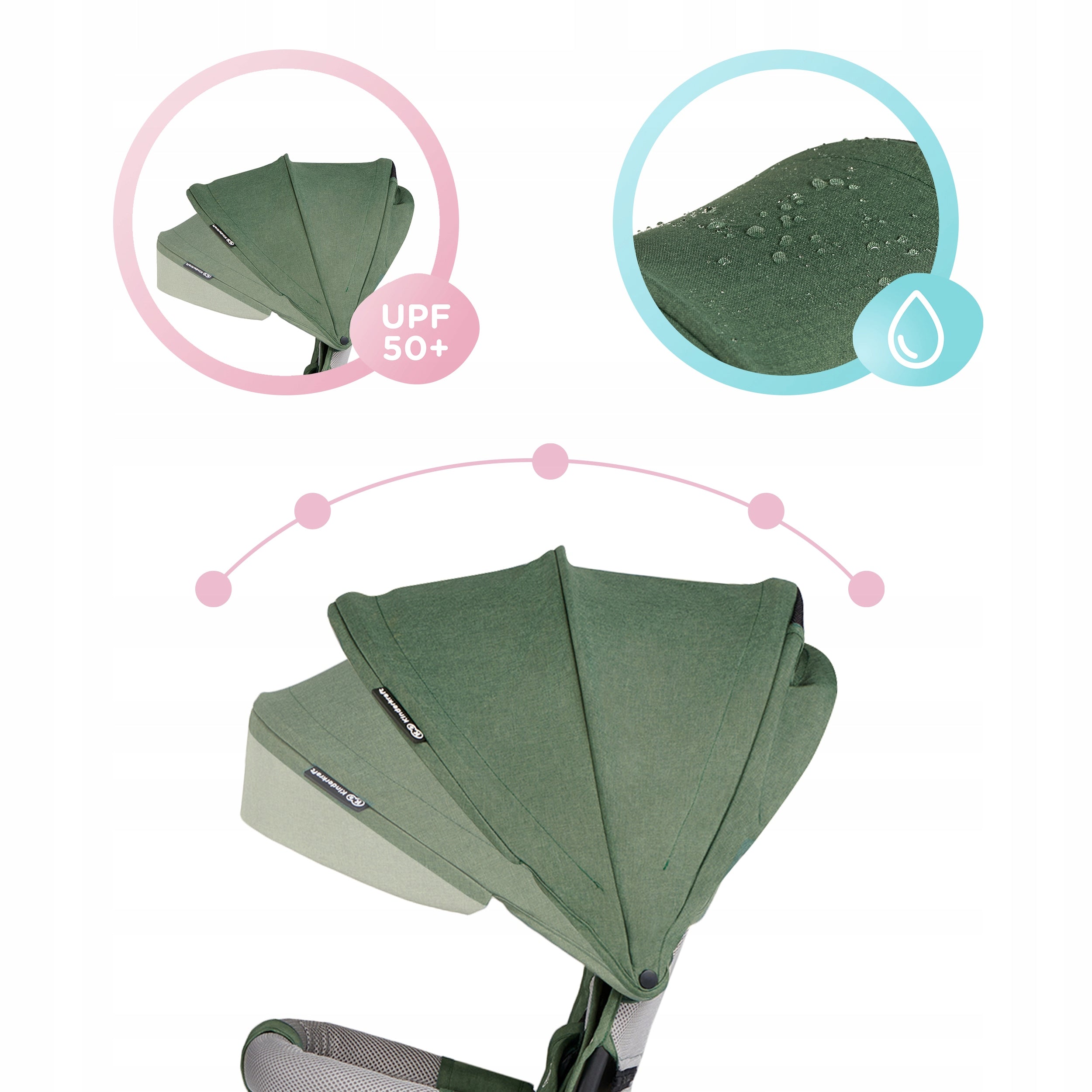 - Aukščiausios Kokybės Medžiagos: Tvirtas plieninis rėmas, patikimi PU ratai ir vandeniui atspari, UPF50+ filtru aprūpinta stoginė užtikrina ilgaamžiškumą ir apsaugą.