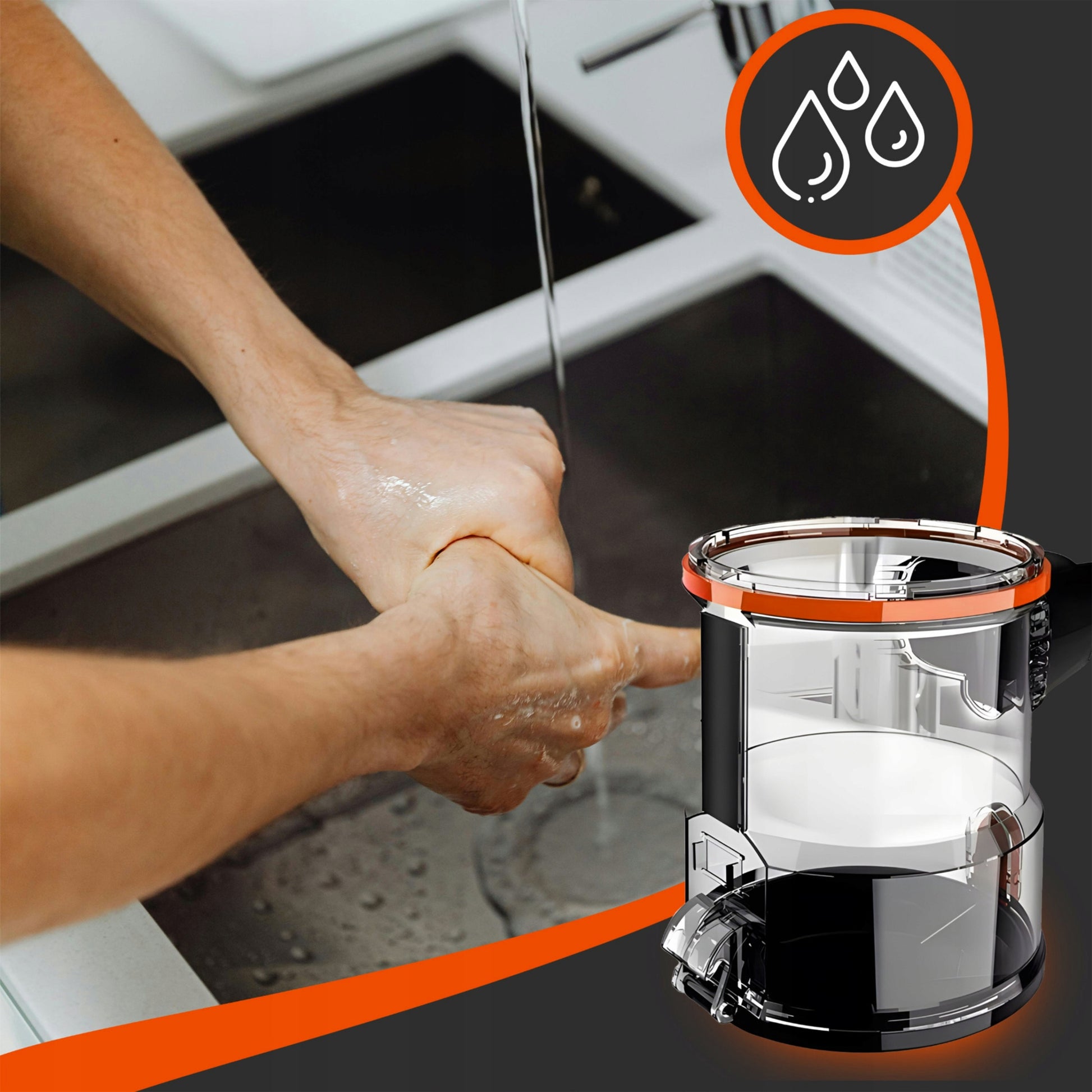 Šis bemaišelis dulkių siurblys yra itin patogus naudoti ir prižiūrėti. Jame įrengta patogi sistema dulkių konteineriui ištuštinti – tiesiog pakelkite siurblį virš šiukšliadėžės, atlaisvinkite fiksatorių ir konteineris lengvai išsituštins. Priežiūra itin paprasta: konteinerį ir filtrą galima plauti vandeniu, užtikrinant higienišką prietaiso būklę. Speciali šilumos išsklaidymo sistema garantuoja ilgesnį prietaiso tarnavimo laiką be perkaitimo rizikos.