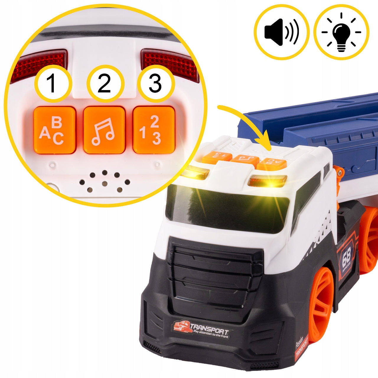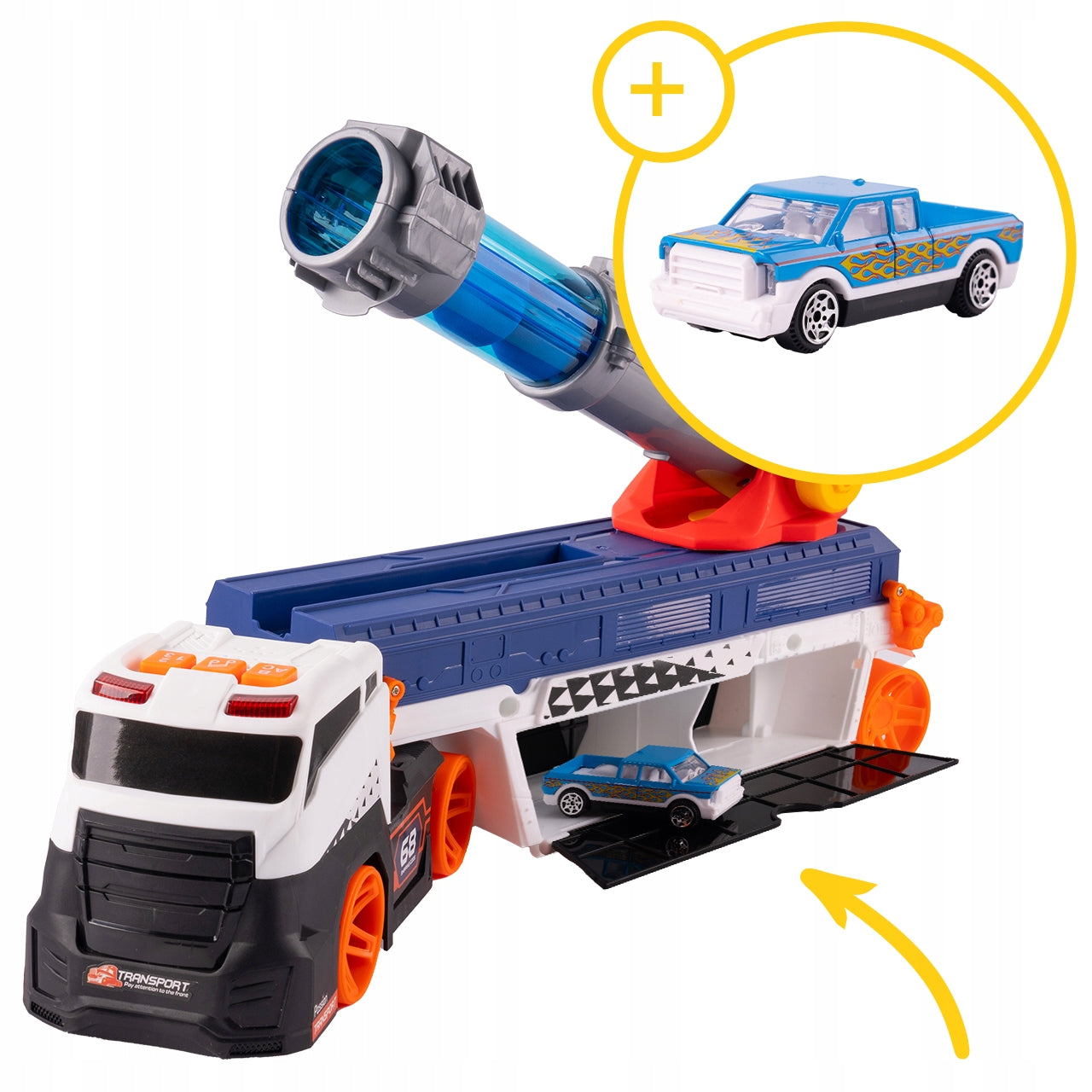 Vilkiko platforma su automobilių paleidimo įrenginiu, sunkvežimis su paleidimo mechanizmu, žaislinis automobilis, šviesa, garsas