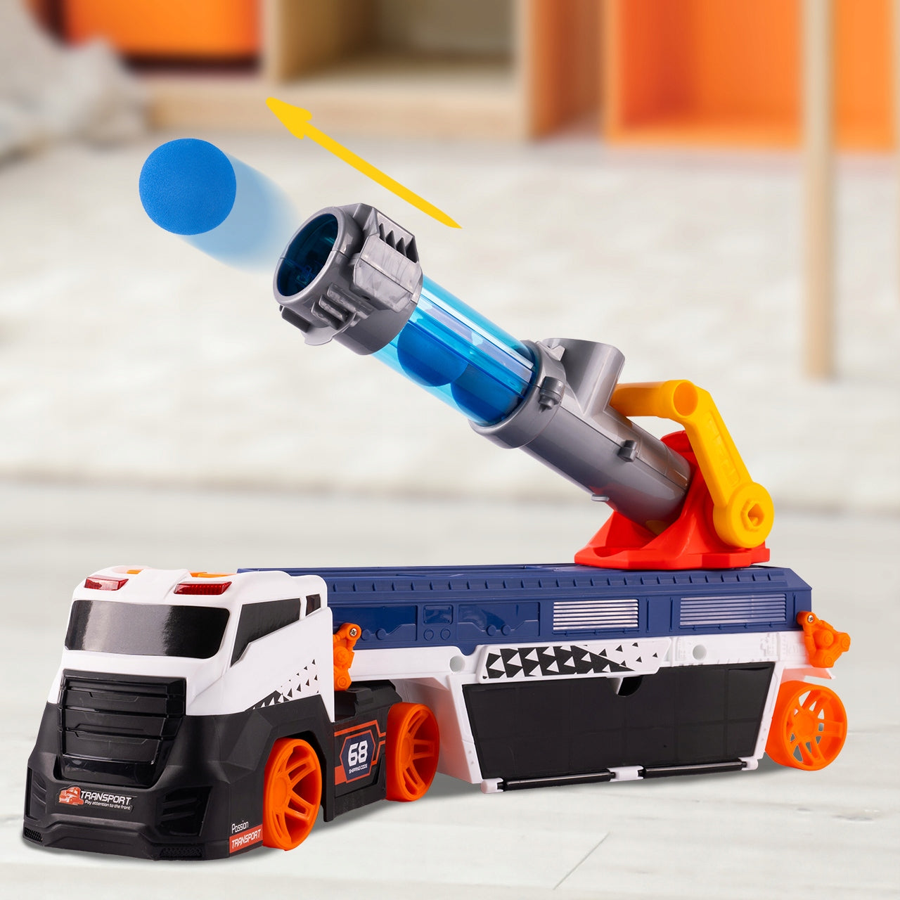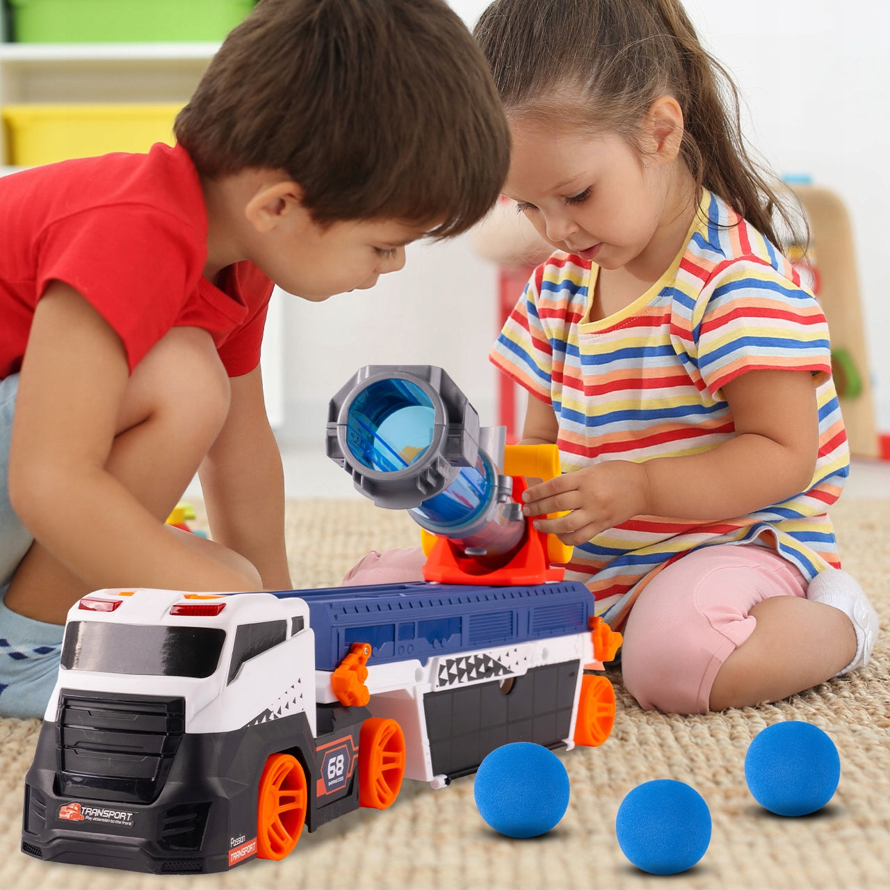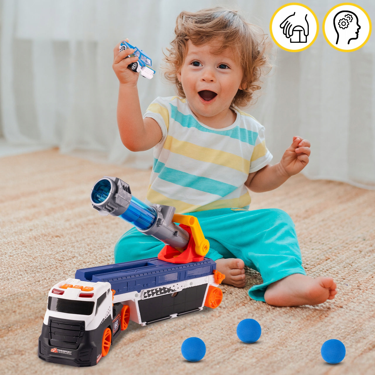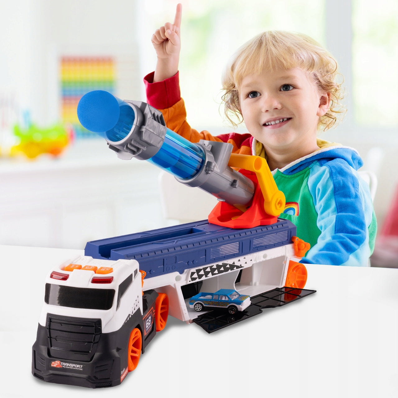 Šis sunkvežimis siūlo du žaidimo režimus: iššauti kamuoliukus arba mažus automobiliukus. Viskas, ko reikia, yra vienas mygtuko paspaudimas, ir vaikas gali pradėti aktyvų žaidimą. Tai ne tik smagu, bet ir lavina vaiko taiklumą bei koncentraciją, mokydama jį atlikti tikslius judesius. Žaislas turi reguliuojamą paleidimo įtaisą, kurį galima judinti vertikaliai ir horizontaliai, suteikiant vaikui daugiau kontrolės ir galimybių siekti įvairių taikinių. Žaidžiant su šia transporto priemone, vaikai mokosi koordinacijos, rankų ir akių sąveikos bei erdvinio mąstymo.