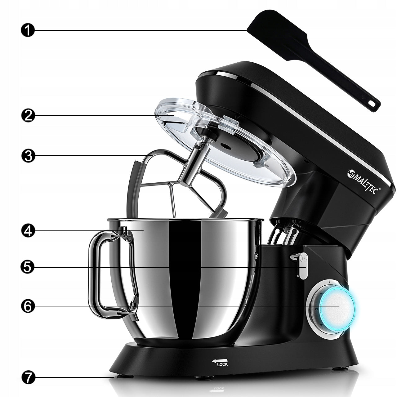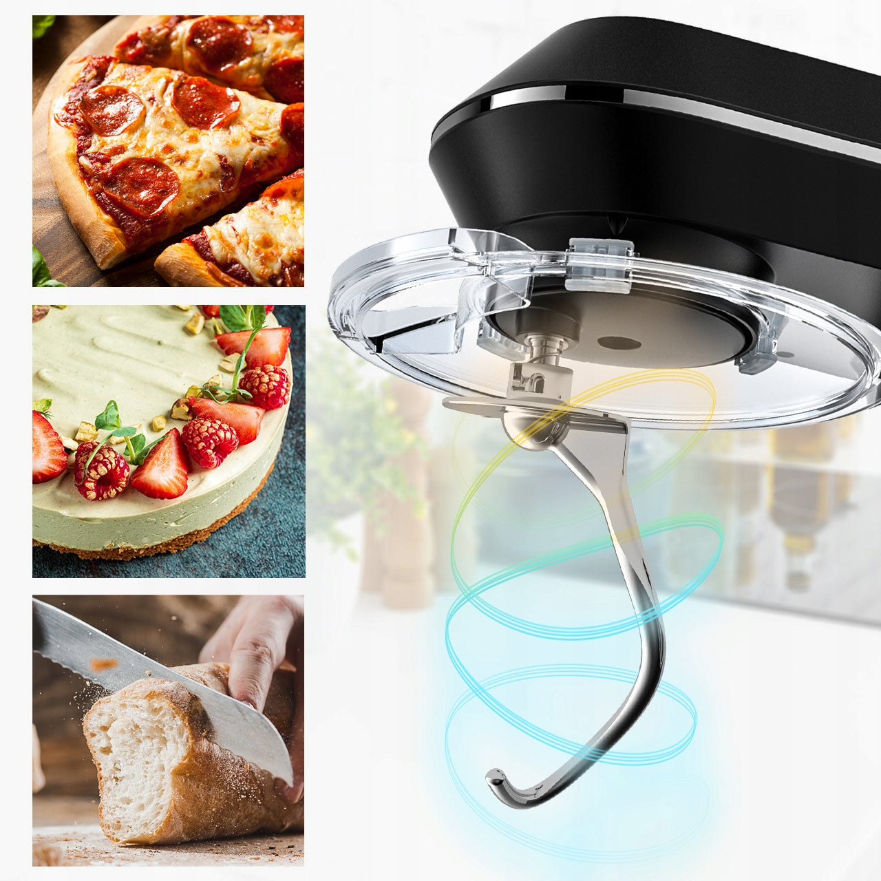 - Tešlos minkymo kabliukas (idealus mielinei tešlai, duonai, picai)