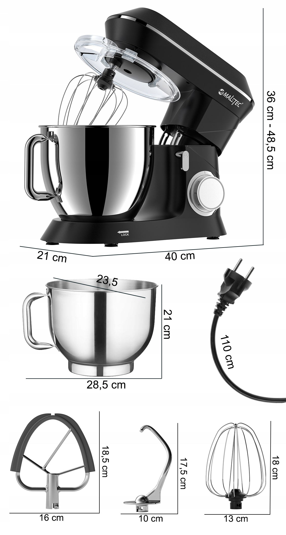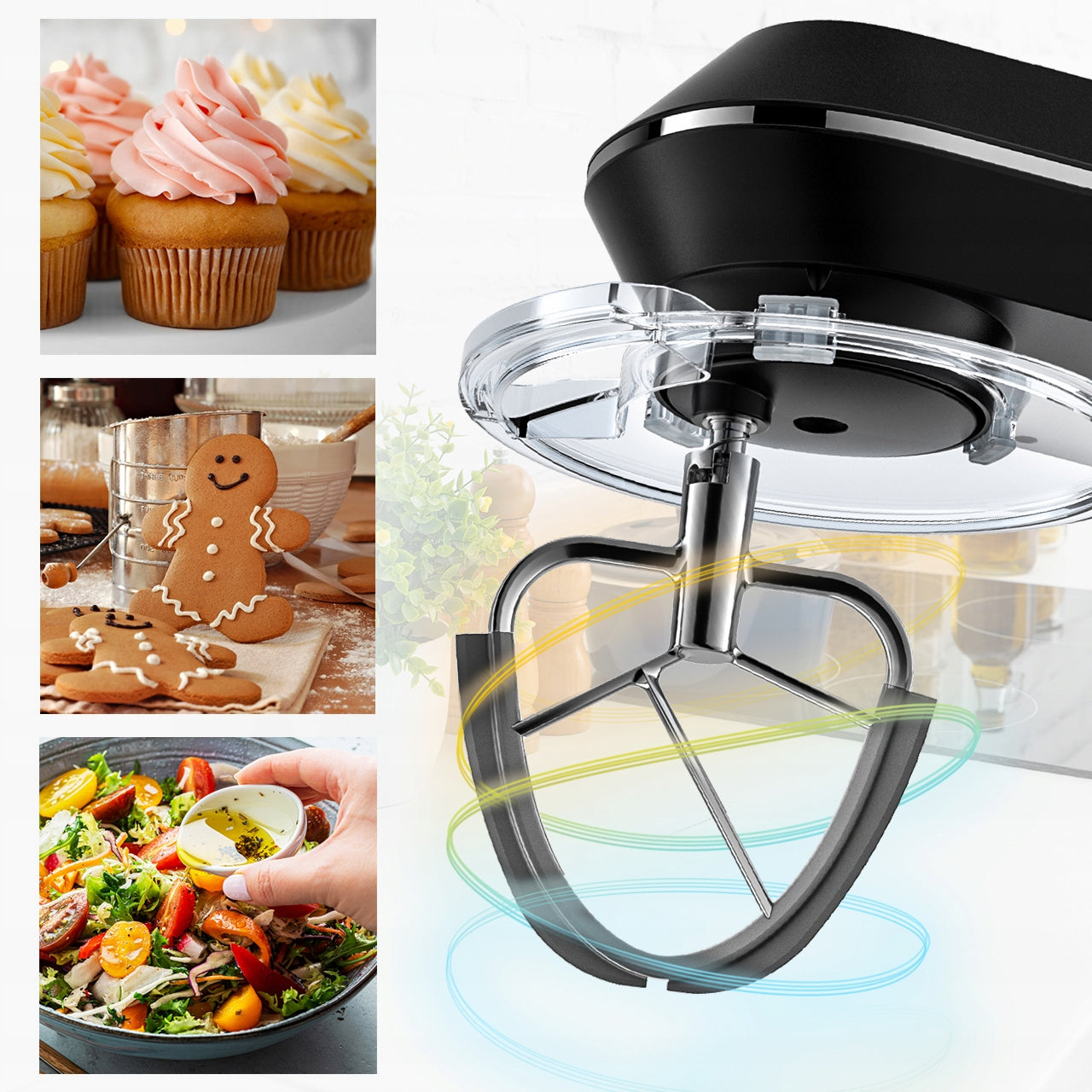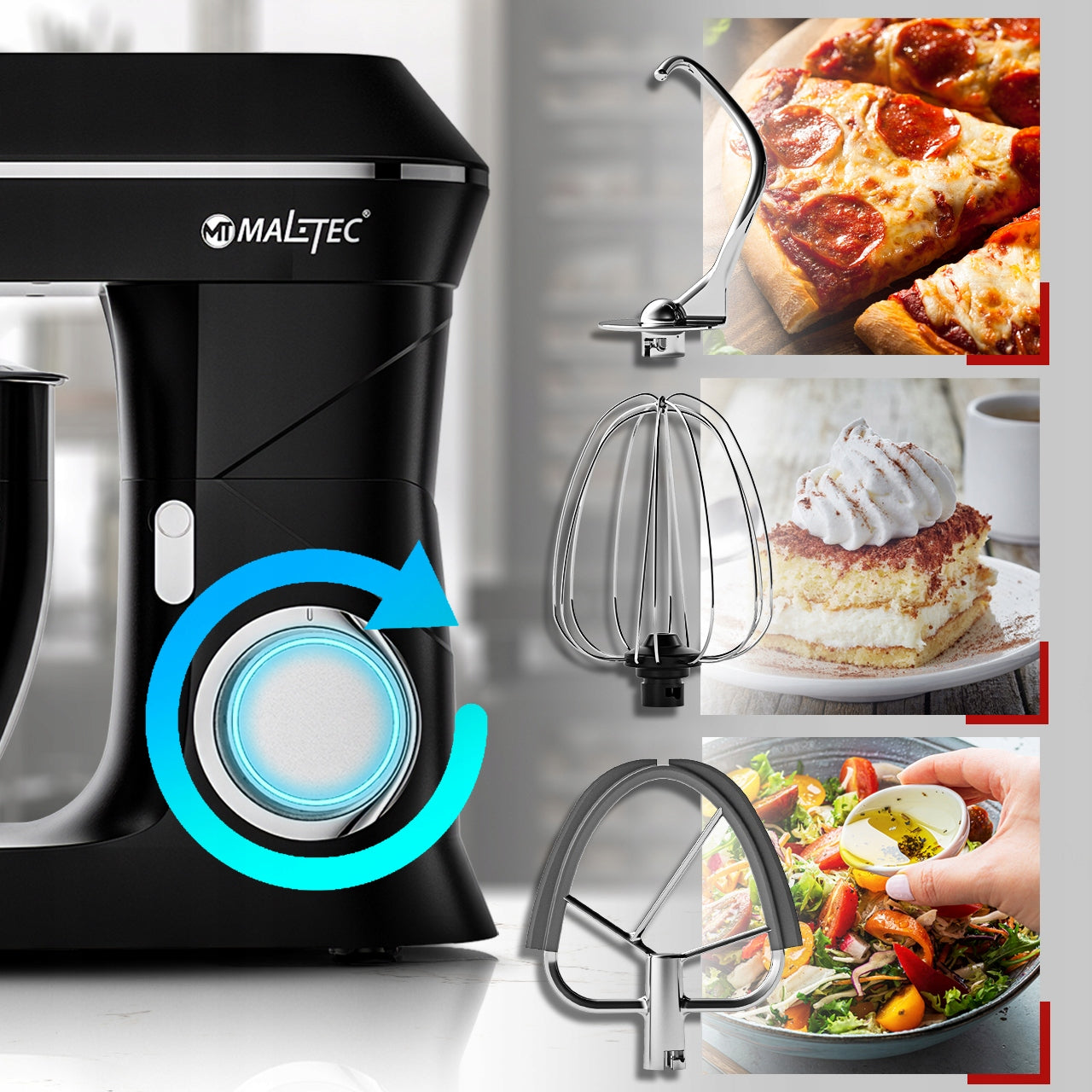 - Universalumas: Keturi pagrindiniai priedai leidžia atlikti daugybę maisto ruošimo užduočių – nuo pyrago tešlos minkymo iki grietinėlės plakimo.