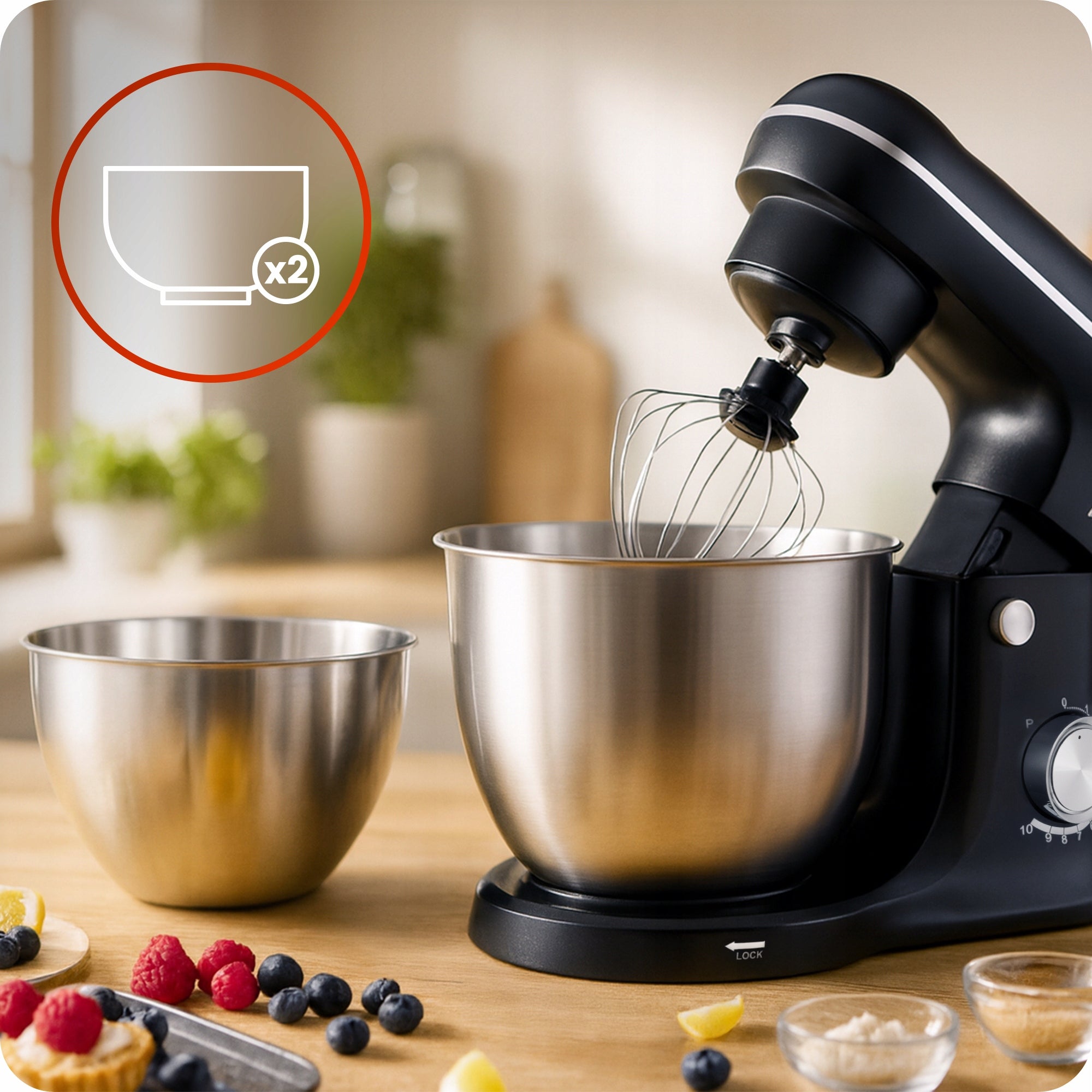 Dėka dviejų skirtingų dydžių nerūdijančio plieno dubenų (5L ir 4L), galėsite patogiai ruošti tiek didesnius, tiek mažesnius maisto kiekius. Tai ypač patogu, kai reikia ruošti kelis patiekalus vienu metu arba kai norite sutaupyti vietos – vienas dubuo telpa į kitą. Nerūdijančio plieno dubenys yra ilgaamžiai, lengvai valomi ir visiškai saugūs sąlyčiui su maistu.