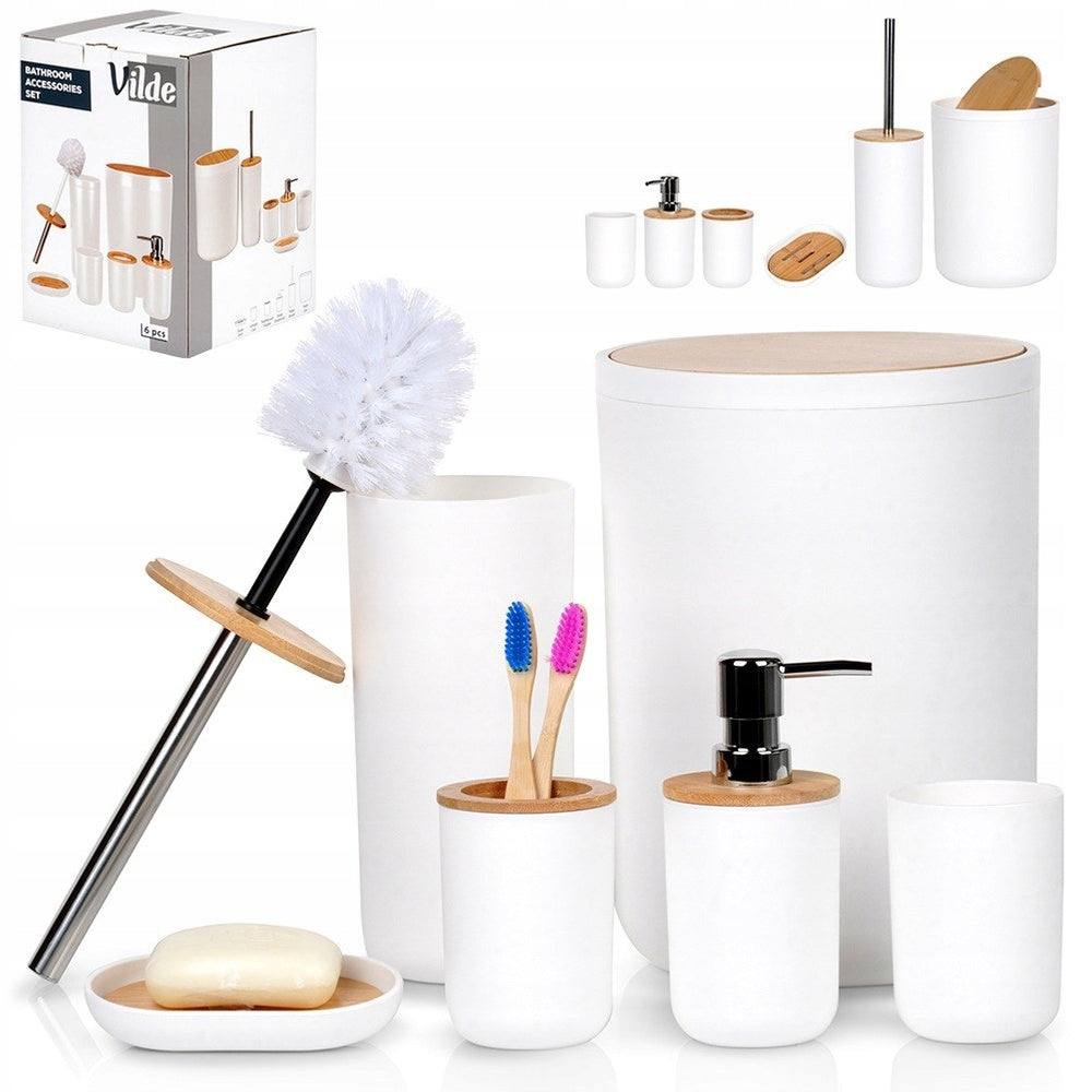 Šis aksesuarų rinkinys yra pagamintas iš aukščiausios kokybės, tvirto balto plastiko, o bambuko medienos detalės suteikia jam subtilios elegancijos ir šilumos. Derinys baltos spalvos su natūraliu medžiu – tai nesenstantis pasirinkimas, kuris ne tik papuoš jūsų vonios kambarį, bet ir sukurs jaukią atmosferą. Minimalistinis, modernus dizainas lengvai dera prie bet kokio interjero stiliaus, nuo klasikinio iki minimalistinio, pridedant išskirtinio charakterio jūsų namams.