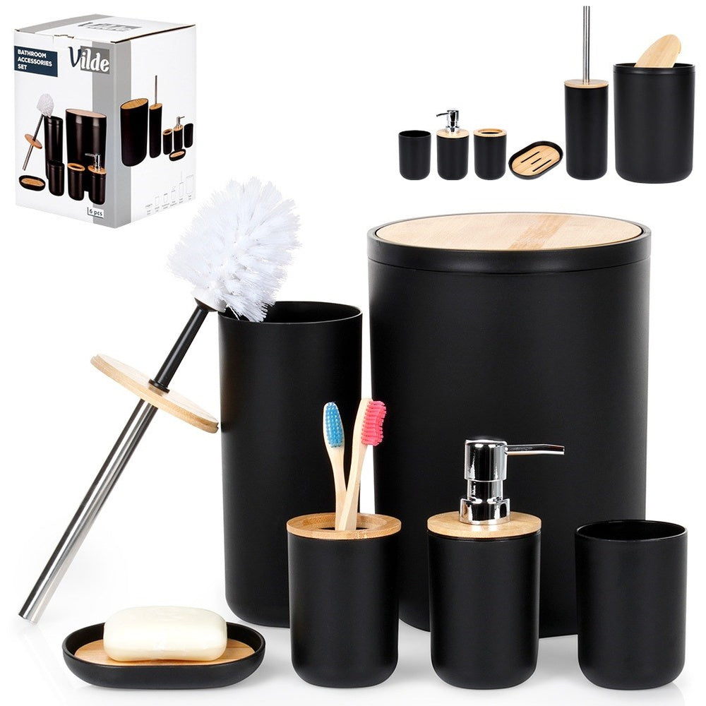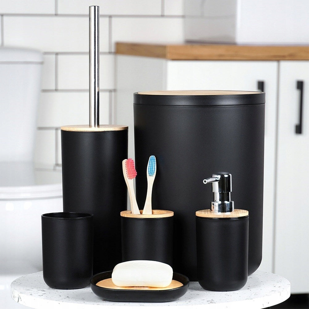 Vonios reikmenų rinkinys: puodelis, WC šepetys, šiukšliadėžė, muilo dozatorius, padėklas