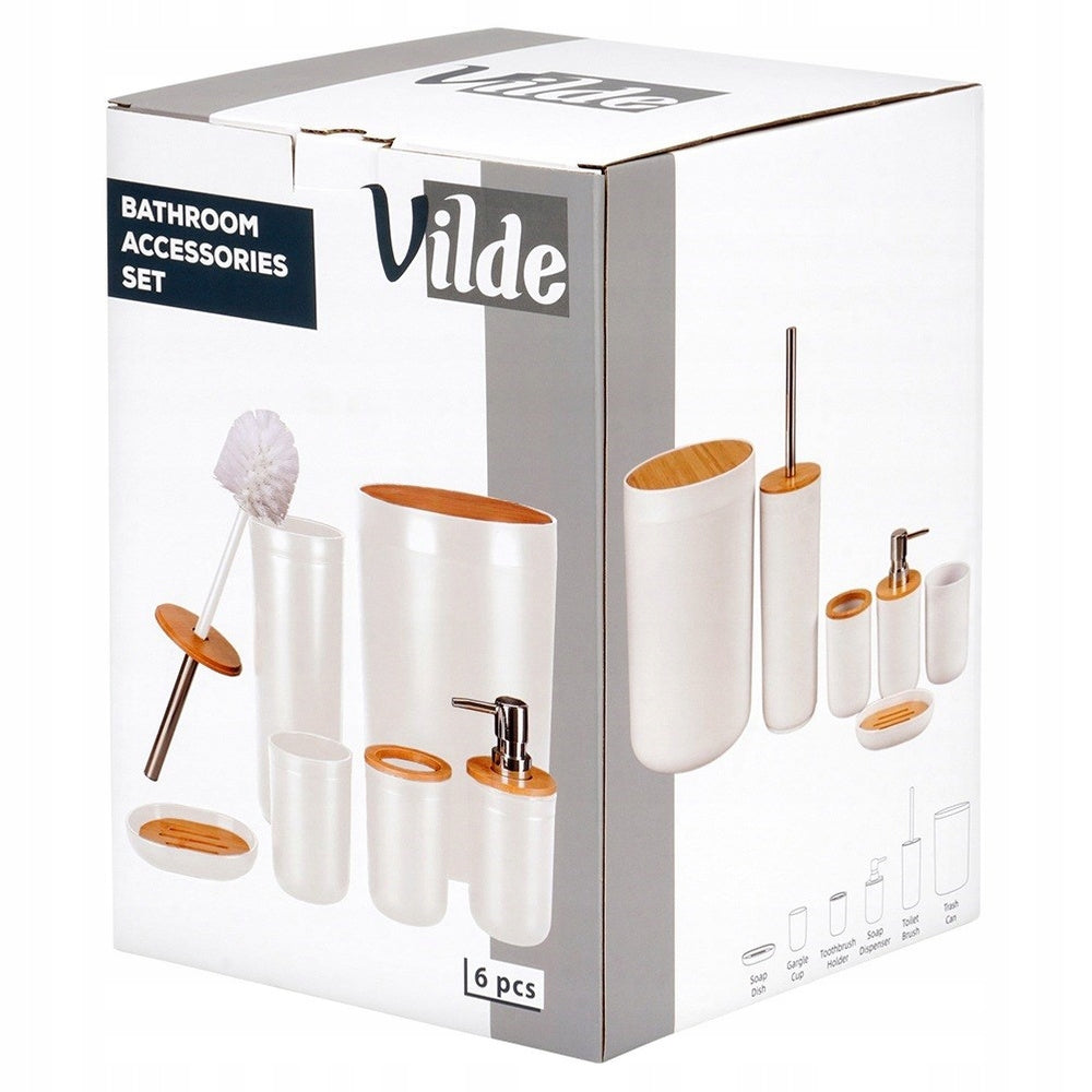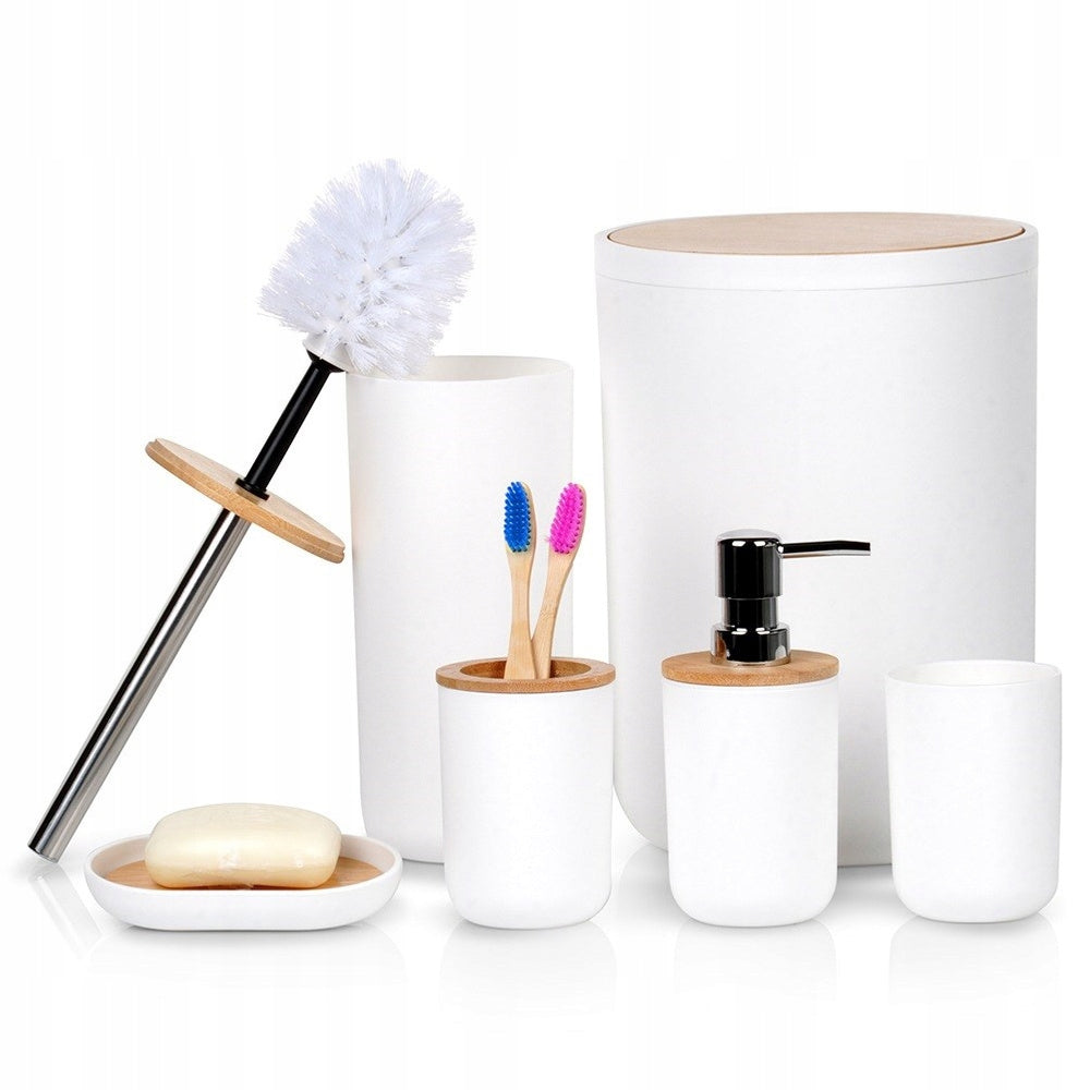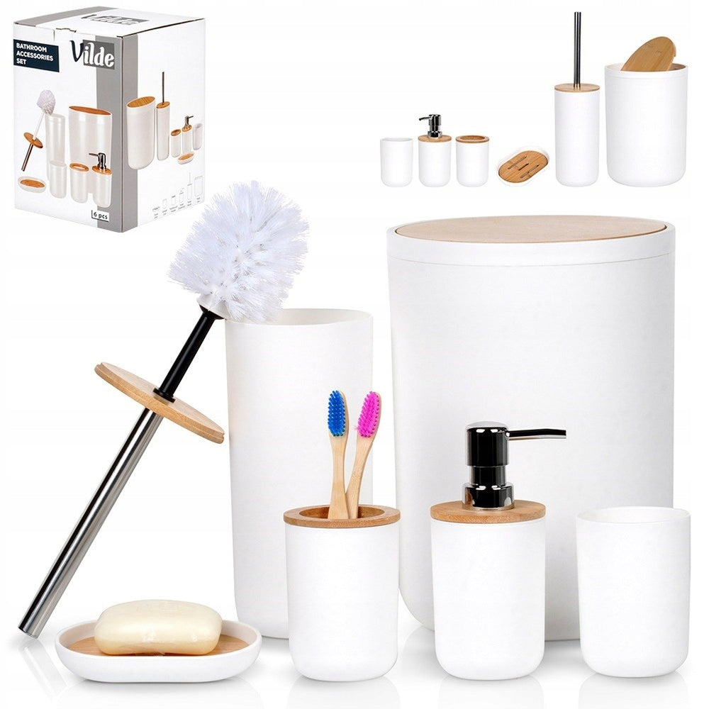 Šis pilnas vonios kambario aksesuarų komplektas leis jums lengvai palaikyti tvarką ir higieną. Kiekvienas elementas pagamintas iš aukščiausios kokybės, ilgaamžio plastiko, papuošto šiltais bambuko medienos elementais. Jie lengvai valomi – tiesiog nuvalykite drėgna šluoste. Tualeto šepetys yra atsukamas, todėl jį valyti bus dar paprasčiau. Šis rinkinys – tai puikus pasirinkimas kiekvienam, vertinančiam stilių, funkcionalumą ir aukštą kokybę. Jis sukurtas atitikti europinius standartus ir praturtinti jūsų namus.