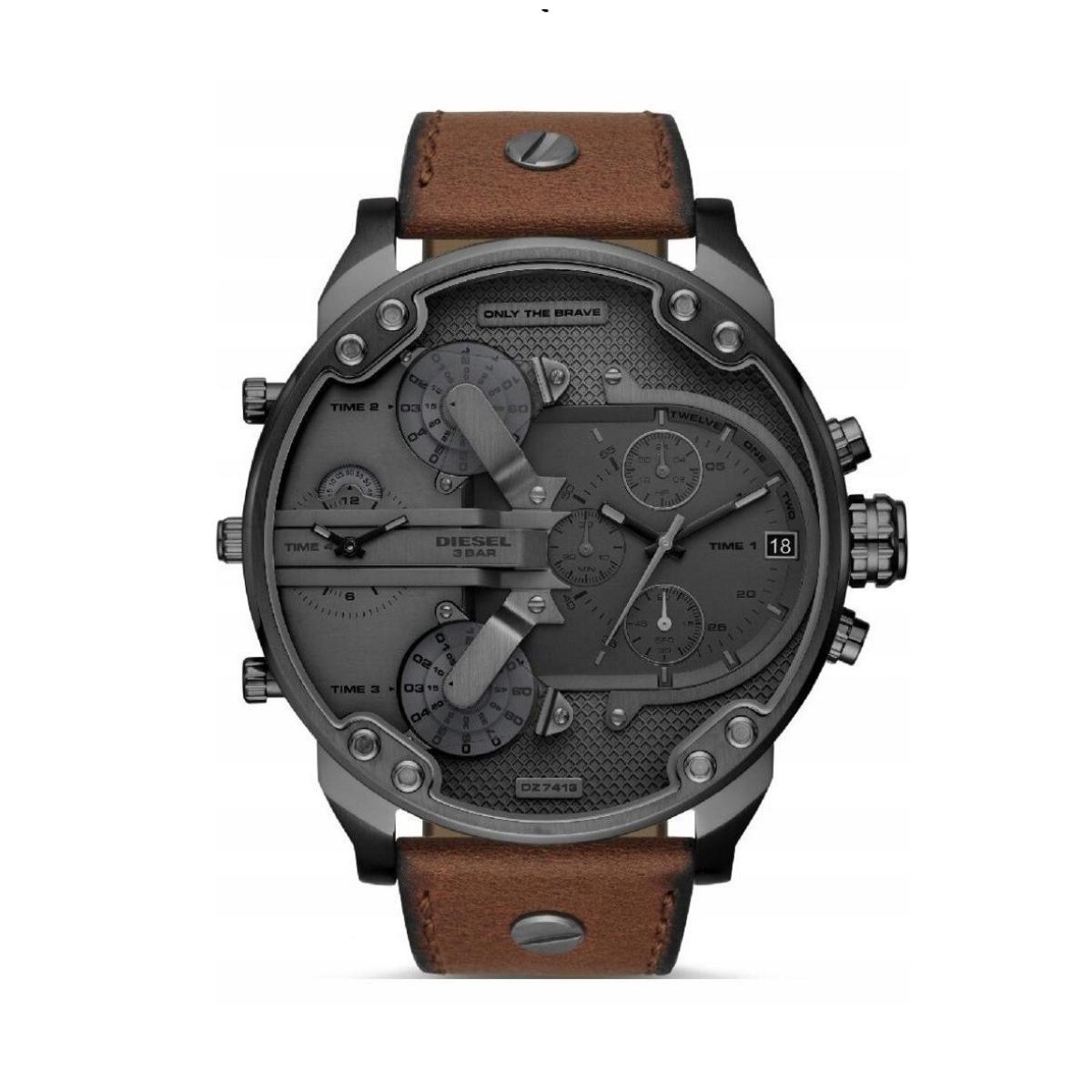 Stambaus dizaino ir išskirtinio charakterio Diesel Mr. Daddy 2.0 DZ7413 – laikrodis vyrams, ieškantiems drąsaus, modernaus ir kartu elegantiško aksesuaro. Juodos spalvos nerūdijančio plieno korpusas derinamas su rudos spalvos natūralios odos dirželiu, suteikiančiu laikrodžiui sportiškos elegancijos. Dideliame ciferblate integruoti 4 nepriklausomi kvarciniai mechanizmai, leidžiantys nustatyti laiką skirtingose pasaulio laiko juostose. Taip pat rasite datos funkciją bei chronografą, kuris pravers tiek kasdienėje veikloje, tiek aktyvesnėse situacijose.
