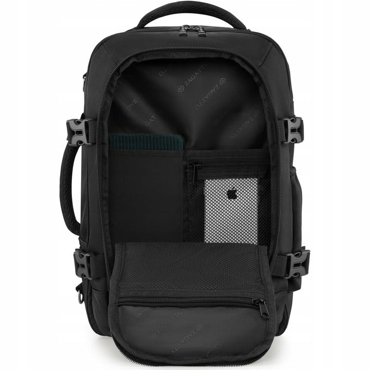 Jeigu ieškai kuprinės, kuri tiksliai atitinka RYANAIR ir Wizzair nemokamo rankinio bagažo išmatavimus, ZAGATTO 40x25x20 cm modelis yra tai, ką turi įsigyti šiandien. Ji ne tik telpa po sėdyne, bet ir talpina daugiau nei tikiesi. Dėl lagamino tipo atsidarymo, specialių skyrių, apsaugos nuo vagysčių ir patogaus nešiojimo – tai daiktas, kuris palengvina kiekvieną kelionę. Jokių kompromisų: tvirta konstrukcija, elegantiškas dizainas, oro linijų standartams pritaikytas dydis. Tau nereikės mokėti už bagažą – ši kuprinė sutaupo pinigus, laiką ir nervus. Keliauk išmaniai, o ne su papildomais mokesčiais.