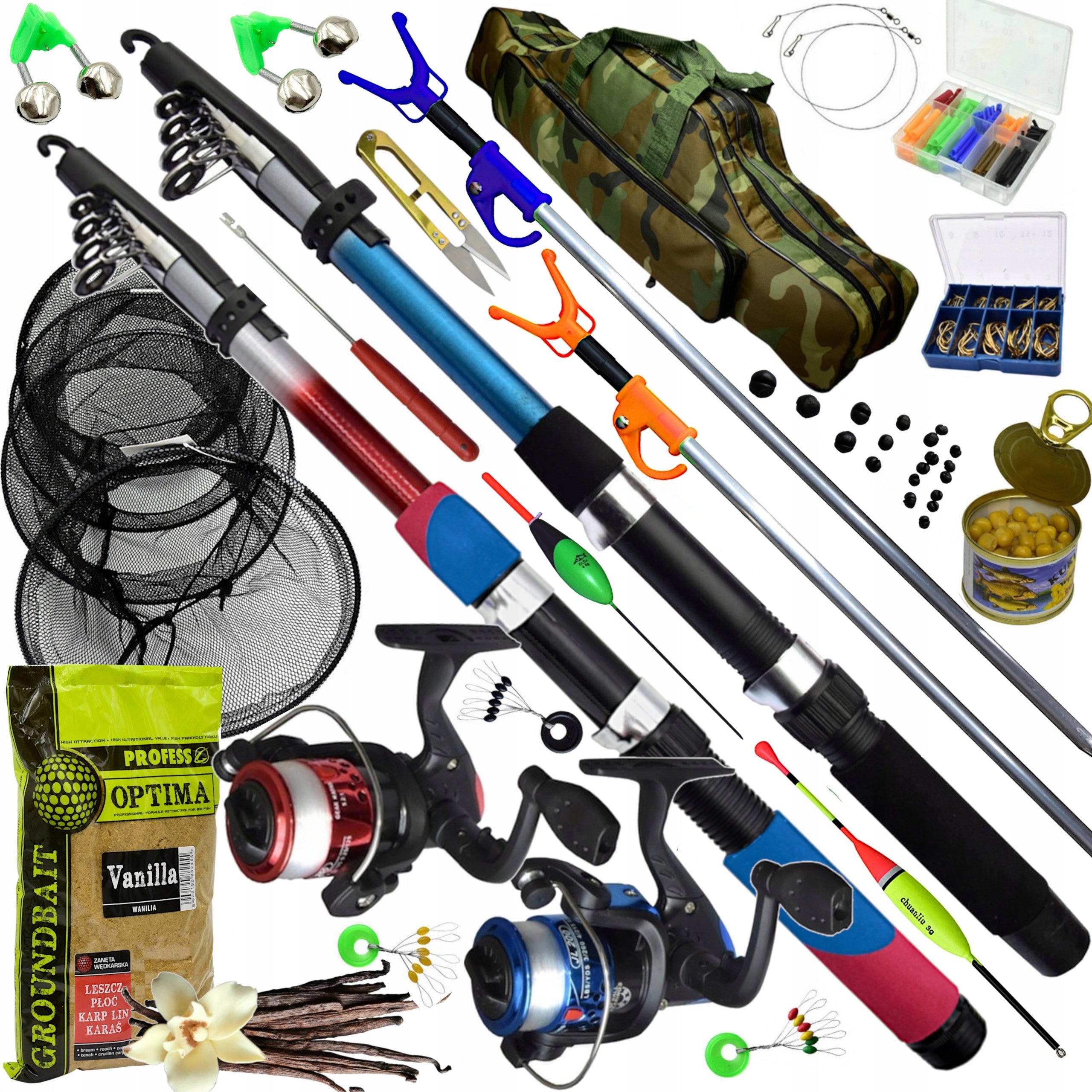 Žvejybos rinkinys 2x meškerė 2x ritė krepšys tinklas stovai jaukas priedai